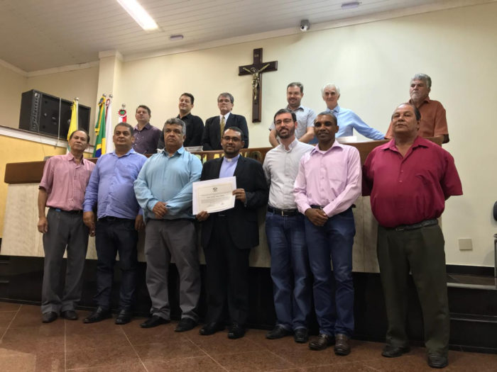 Na segunda-feira, 03 de dezembro, a Câmara Municipal de Luz, por meio do vereador Aldair Paula Duarte, fez a entrega de uma Moção Honrosa ao padre Patriky Samuel Batista, pelo reconhecimento do excelente trabalho desenvolvido junto as comemorações do Centenário da Diocese de Luz.