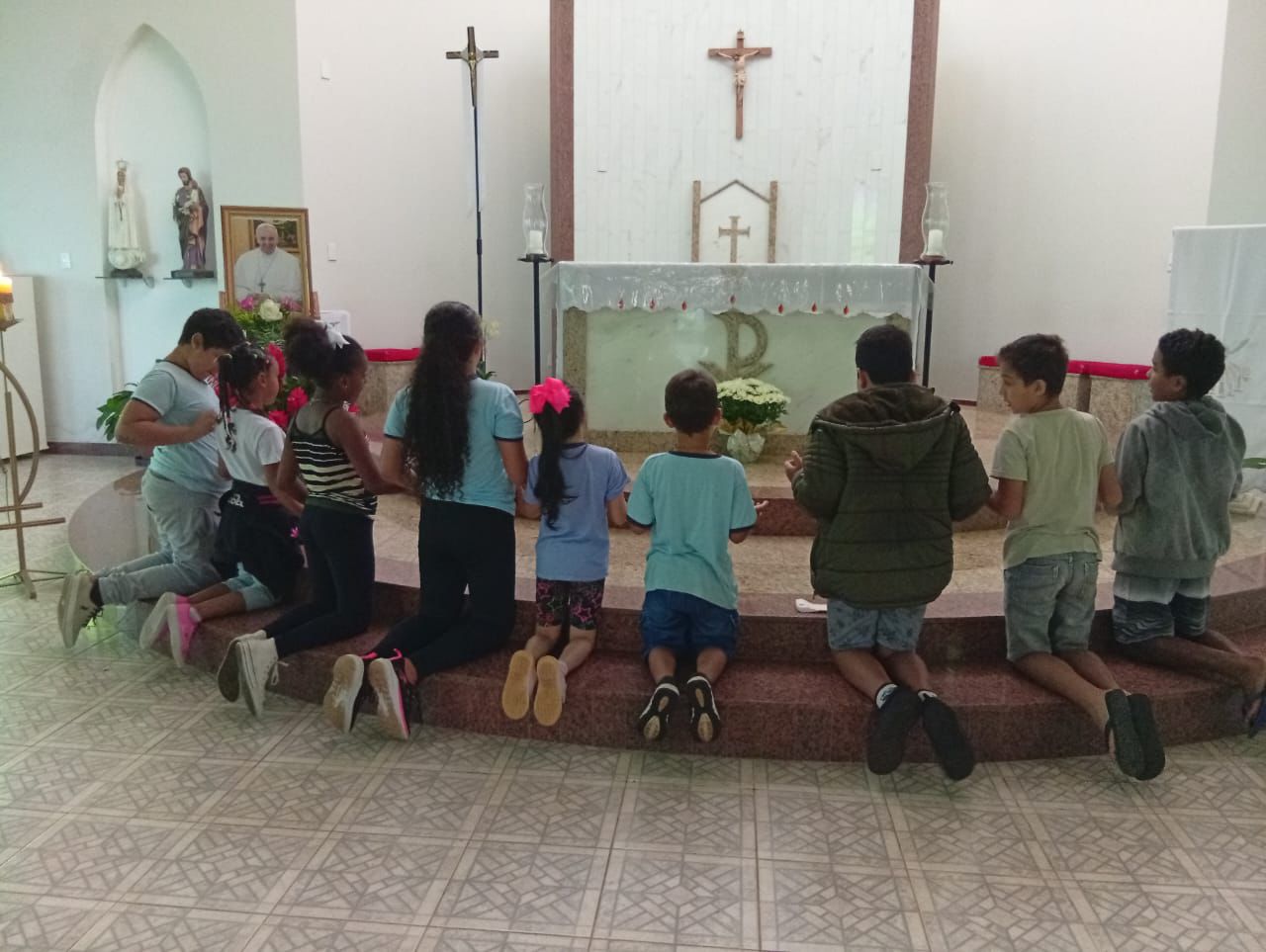 Cada tarde foi conduzida por diferentes turmas da catequese, sob a coordenação da catequista Beatris:
