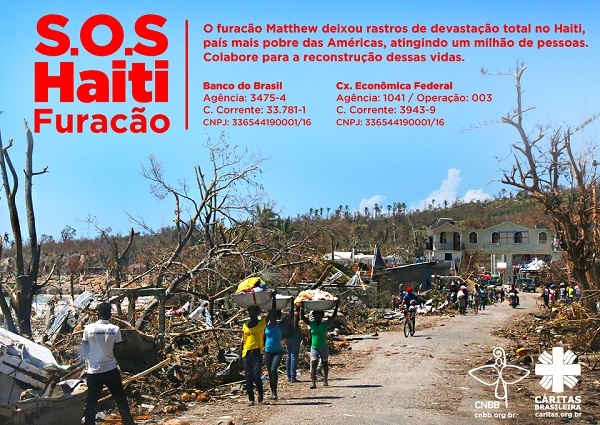 A Conferência Nacional dos Bispos do Brasil (CNBB) e a Cáritas Brasileira lançaram na quinta-feira, dia 13 de outubro, uma campanha SOS em solidariedade às vítimas do furacão Matthew, que atingiu o Haiti, no dia 4 de outubro. Estima-se que um milhão de pessoas tenham sido afetadas pelas tempestades e que o número de mortes possa passar de 1 mil. Este foi o pior desastre enfrentado pelo país desde o terremoto de janeiro de 2010, quando mais de 300 mil haitianos e haitianas morreram. Ainda hoje há dezenas de milhares de pessoas vivendo em barracas devido às consequências do terremoto, o que agrava ainda mais a situação do país com a passagem do furacão Matthew.