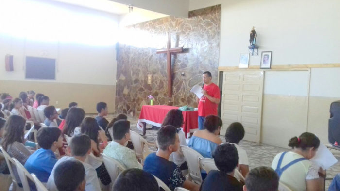 Rodrigo explanou aos adolescentes no primeiro momento conduzindo-os a refletir para onde seus pés os levam, ou seja, onde está o seu coração?Em seguida, mostrou-lhes que cada um é reflexo do que aprende em casa; no terceiro momento mostrou-lhes que, para Deus não importa o passado, mas as atitudes de cada um após darem mais um passo na fé ao receberem o Sacramento da Crisma. Pediu-lhes que escrevessem cartas para seus familiares e também para Jesus conduzindo-os a se comprometerem com Ele em todos os momentos de suas vidas.