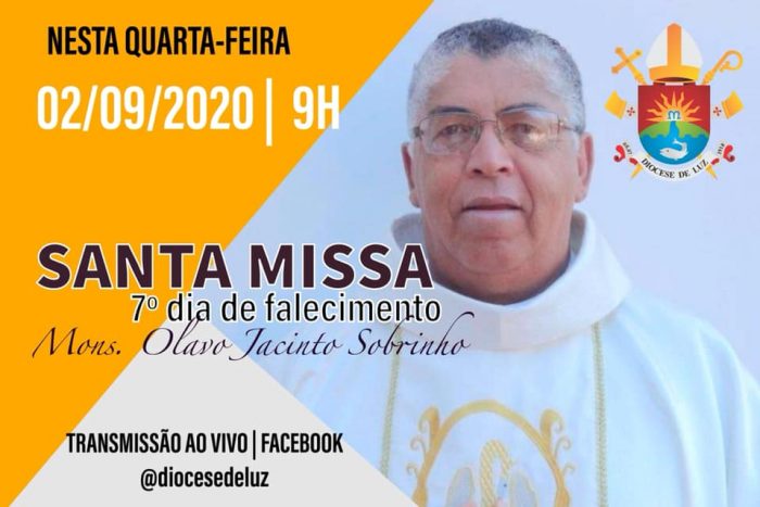 A Missa de 7º dia de falecimento do Monsenhor Olavo Jacinto Sobrinho será nesta quarta-feira, 02 de setembro, às 09h00, na Catedral Diocesana Nossa Senhora da Luz, em Luz. A celebração será transmitida pelas redes sociais da diocese.