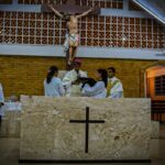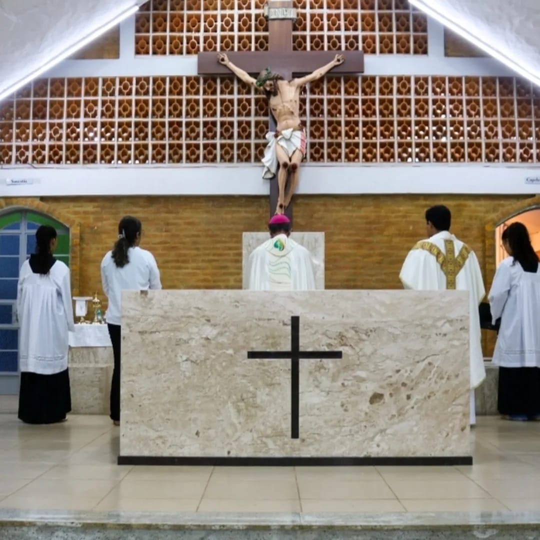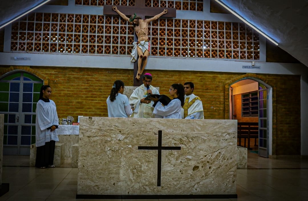 Em seguida, ocorreu o revestimento do altar, simbolizando que aquele local é o altar do sacrifício e, ao mesmo tempo, a mesa do Senhor, onde se recorda a morte e ressurreição de Cristo. As velas foram acesas, lembrando que Cristo é “a luz do mundo”.