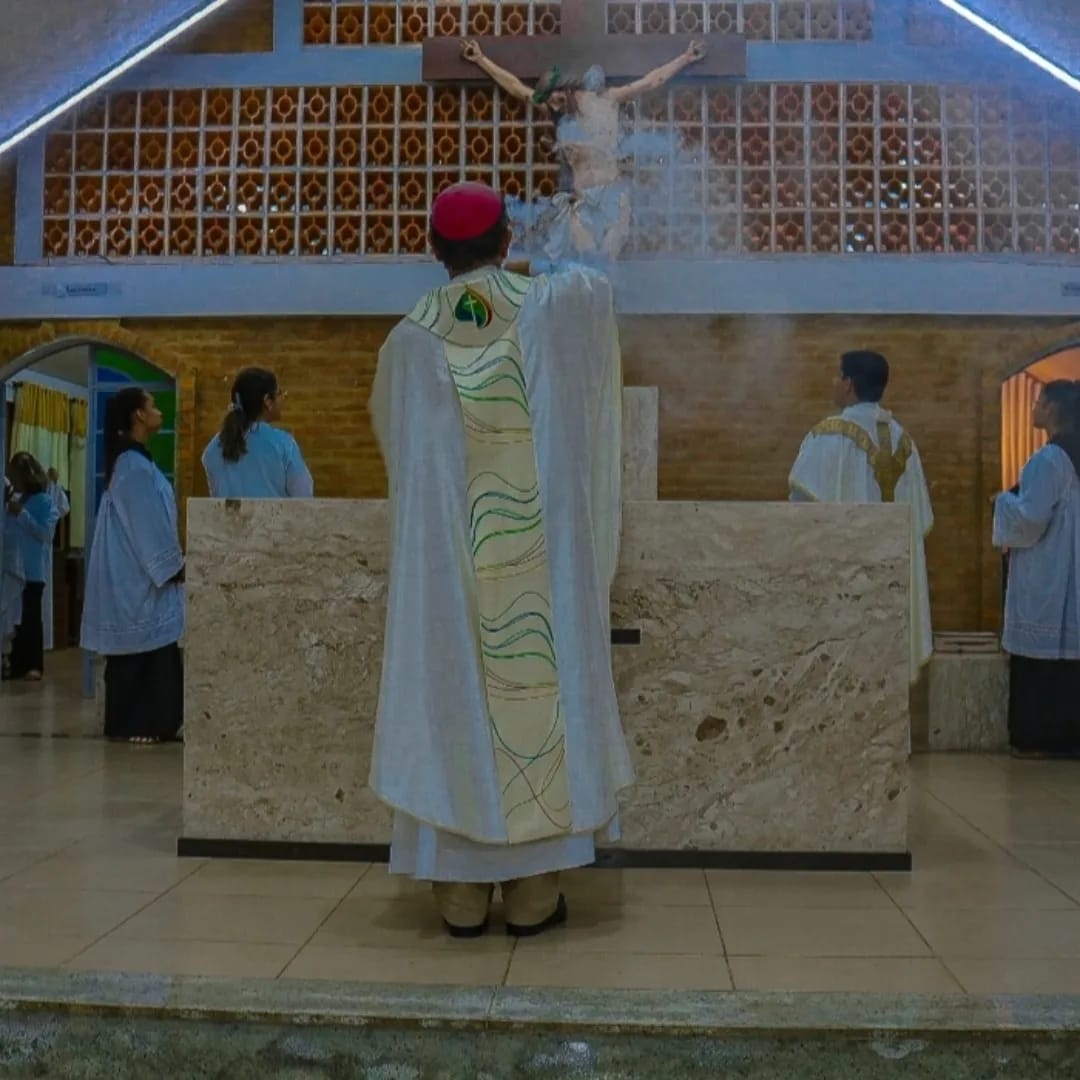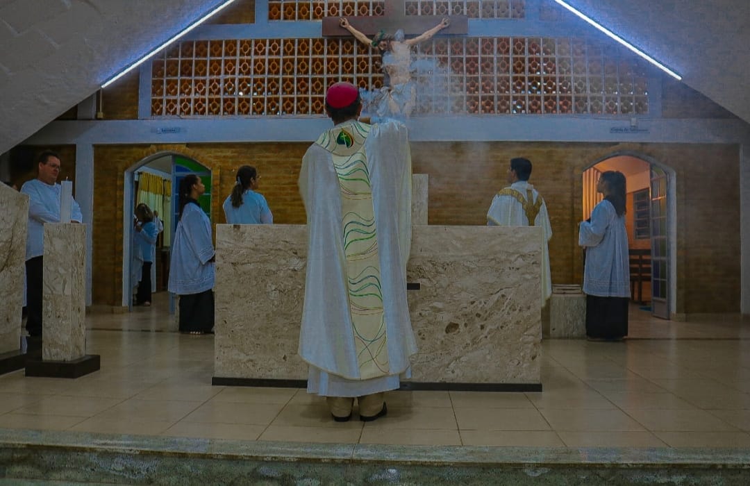 Na sequência, foi realizada a incensação do altar. A queima do incenso recorda o sacrifício de Cristo, também utilizada para expressar que o sacrifício da Igreja e as orações dos fiéis chegam até Deus.