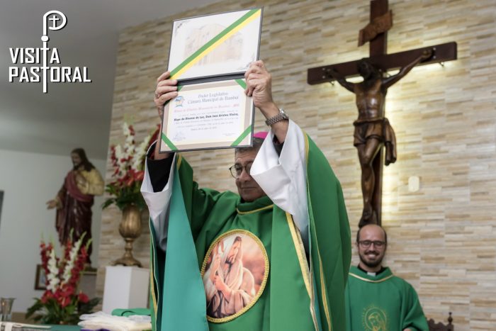 Durante suas andanças em Bambuí, o bispo da Diocese de Luz, no último dia na cidade, celebrou a Santa Missa e durante ao agradecimentos e homenagens recebeu também, o Título de cidadão Benemérito, concedido pela câmara de vereadores, através de sua secretária Graciele Cruvinel, por todos os serviços prestados pela diocese à cidade.