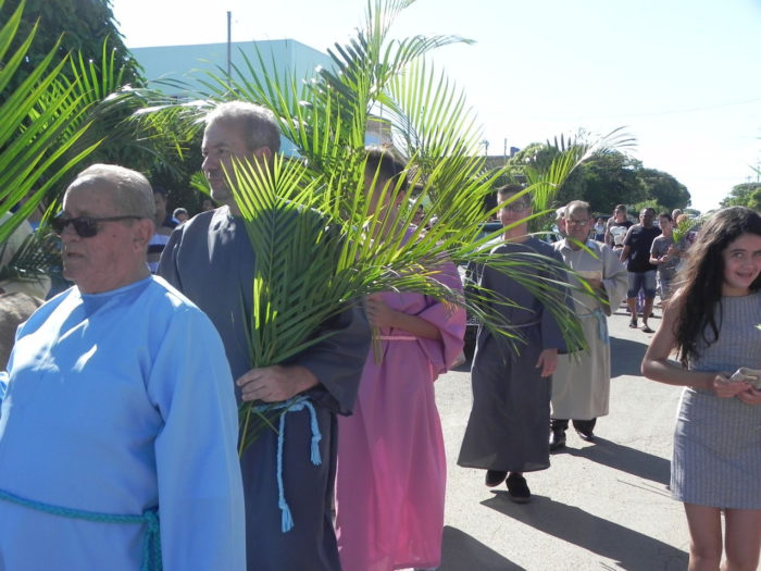 A celebração iniciou em frente o Salão São Pedro com a bênção dos ramos deslocando para a Comunidade São João Paulo II, onde houve a missa campal, celebrada pelo padre Pedro Felisberto.