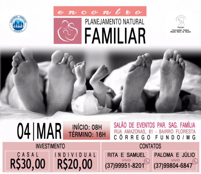 No domingo 04 de março, será realizado o encontro sobre Planejamento Natural Familiar, por meio do Método de Ovulação Billings (MOB). O evento será no Salão de Eventos da Paróquia Sagrada Família, em Córrego Fundo. O salão encontra-se na Rua Amazonas – 81, bairro Floresta.