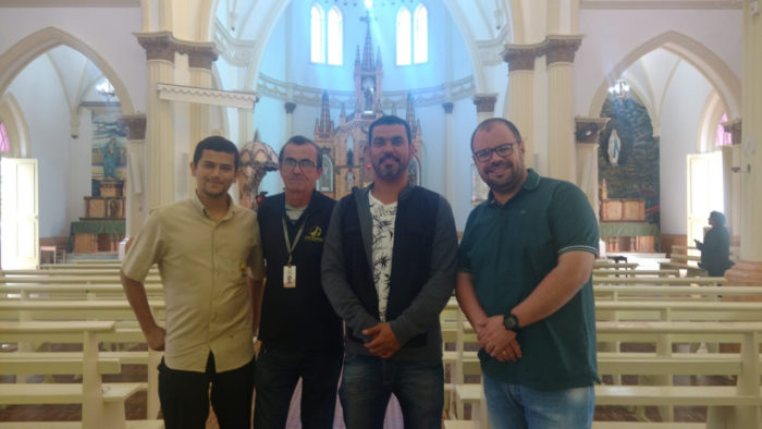O assessor da Pascom, padre Igor Valadão, a jornalista Bernadete Seixas e o secretário da Cúria Breno Vasconcelos, estiveram reunidos na manhã desta terça-feira, 19 de junho, na Catedral Nossa Senhora da Luz recebendo a equipe da TV Horizonte, de Belo Horizonte, para discutirem e organizarem os pontos técnicos para a transmissão da solenidade do jubileu.