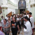 Passando pelo corredor humano, formado por Dom Aristeu e os padres da Forania – Pe. Renato, SDN, Pe. Estevam, SDN, Pe. Heraldo, SDN, Pe. Antônio Carlos, Pe. Marco Túlio, Pe. Paulo César, Pe. De Simone, Pe. Marcos Tiago, Pe. Ildo, Pe. Roger, também o Pe. Dênis e Padre André, SDN, e alguns seminaristas – o povo de Deus, em uma demonstração de fé, sem atropelos, foi ocupando seus lugares, aceitando o convite para esse momento único em nossa forania.