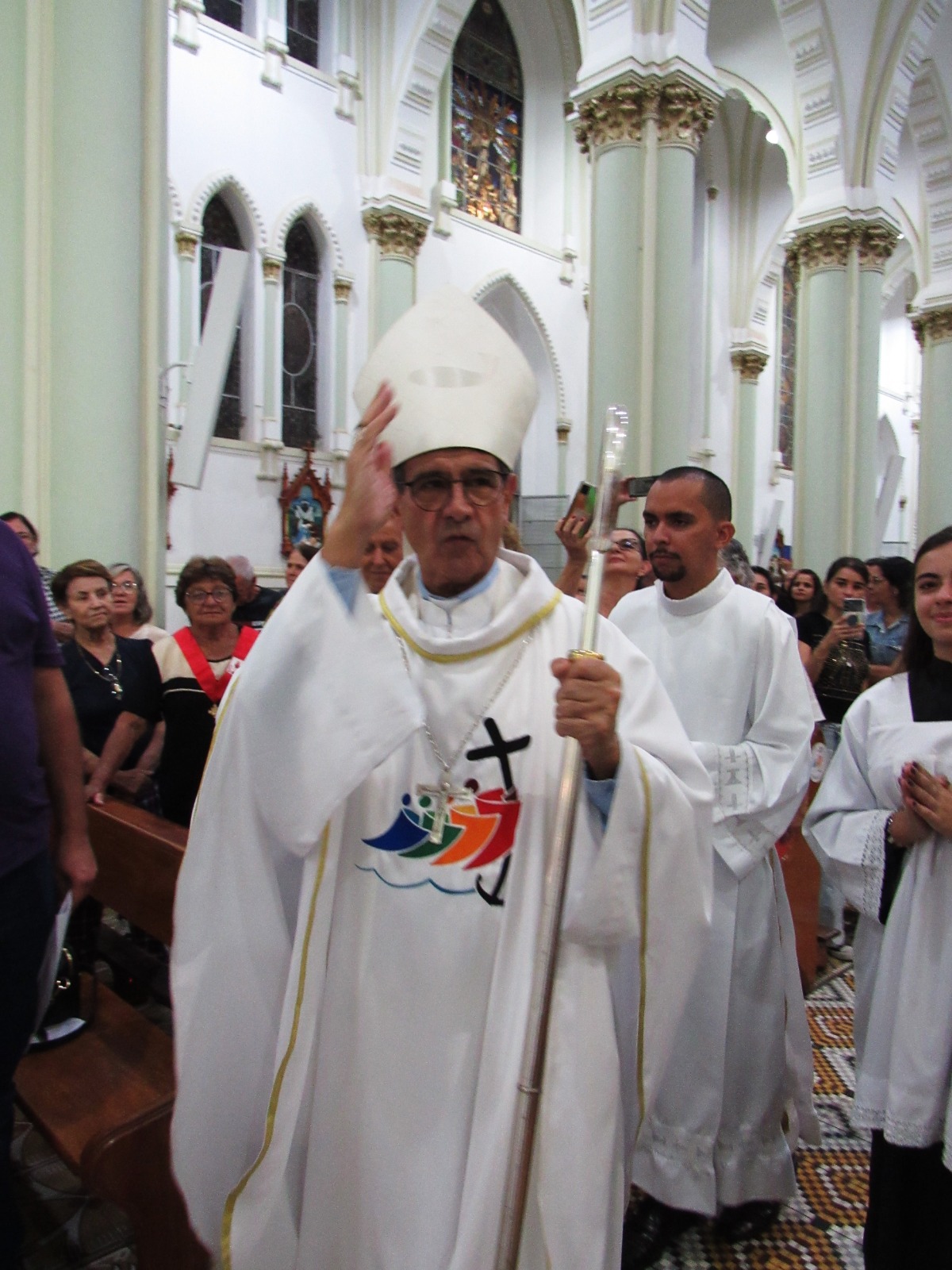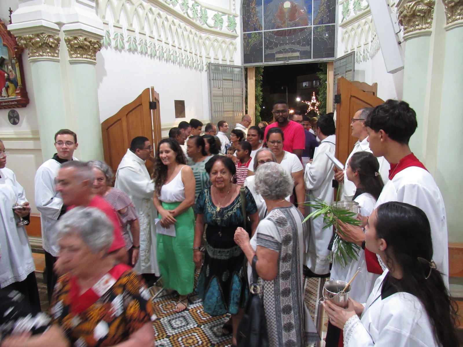 Passando pelo corredor humano, formado por Dom Aristeu e os padres da Forania – Pe. Renato, SDN, Pe. Estevam, SDN, Pe. Heraldo, SDN, Pe. Antônio Carlos, Pe. Marco Túlio, Pe. Paulo César, Pe. De Simone, Pe. Marcos Tiago, Pe. Ildo, Pe. Roger, também o Pe. Dênis e Padre André, SDN, e alguns seminaristas – o povo de Deus, em uma demonstração de fé, sem atropelos, foi ocupando seus lugares, aceitando o convite para esse momento único em nossa forania.