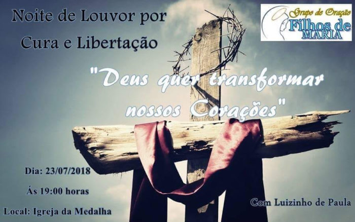 Na próxima segunda-feira, 23 de julho, às 9h00, na Igreja da Medalha, haverá uma Noite de Louvor, com a presença do membro do Ministério de Oração por Cura e Libertação, de Formiga, Luizinho de Paula.