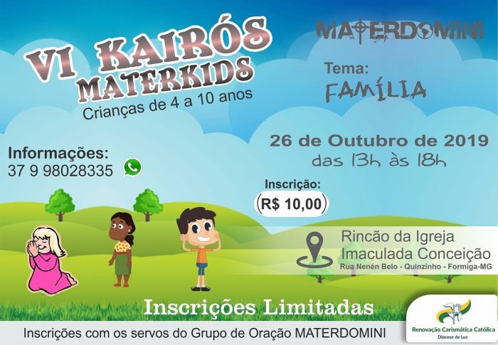 O Grupo de Oração Materdomini da cidade de Formiga através do Ministério Materkids realizará um encontro para a evangelização de crianças de 4 a 10 anos de idade.