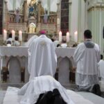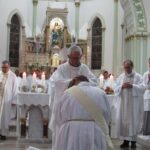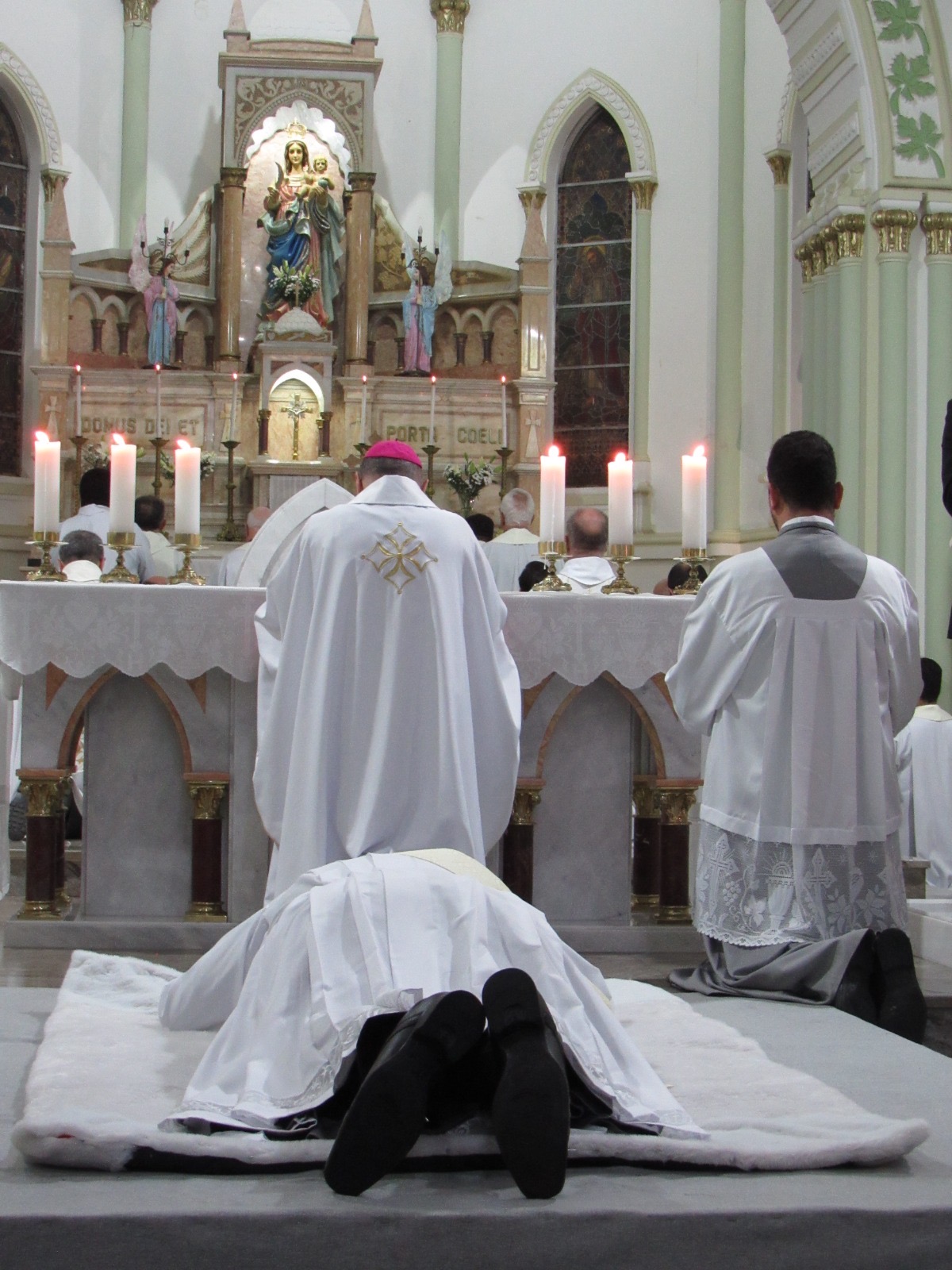 Momento ímpar da celebração, a ladainha, quando o diácono Frater Felipe Cunha se prostrou no chão, diante do altar, fazendo sua entrega total como missionário do Senhor.