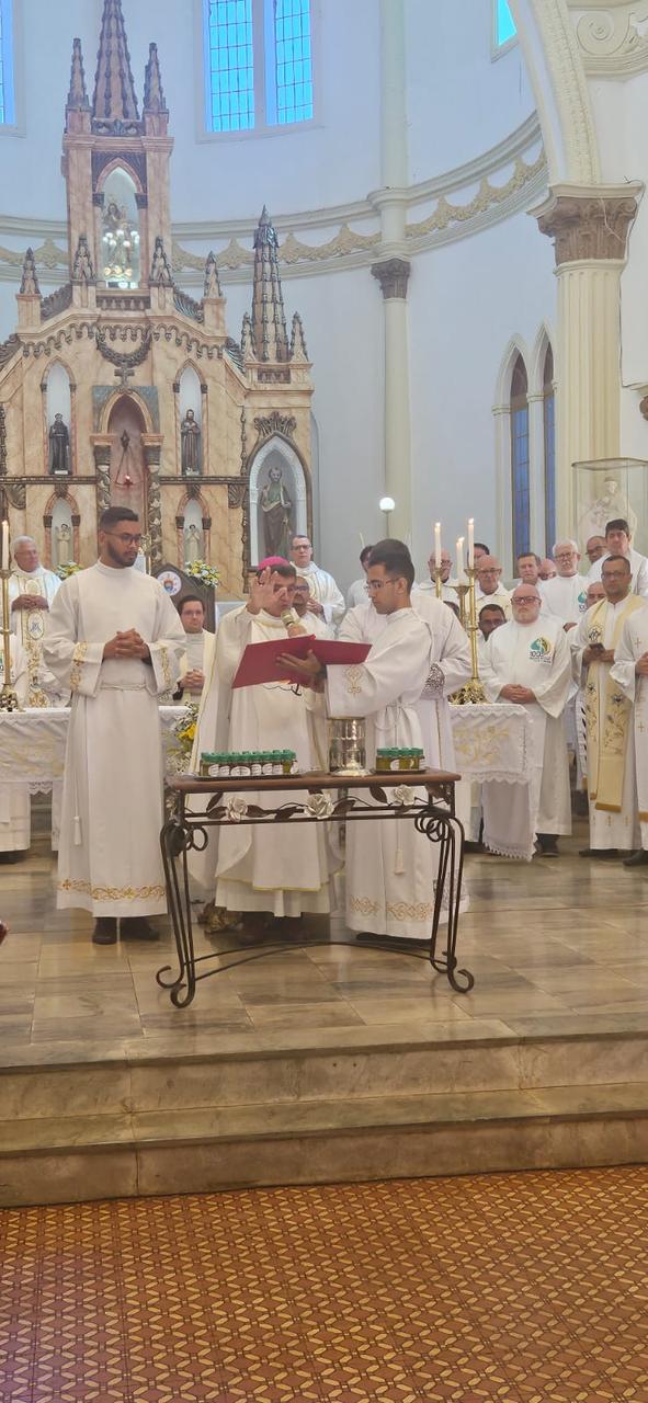 Na celebração, foram abençoados os óleos que serão usados nas cerimônias sacramentais do Batismo, Crisma e Unção dos Enfermos.