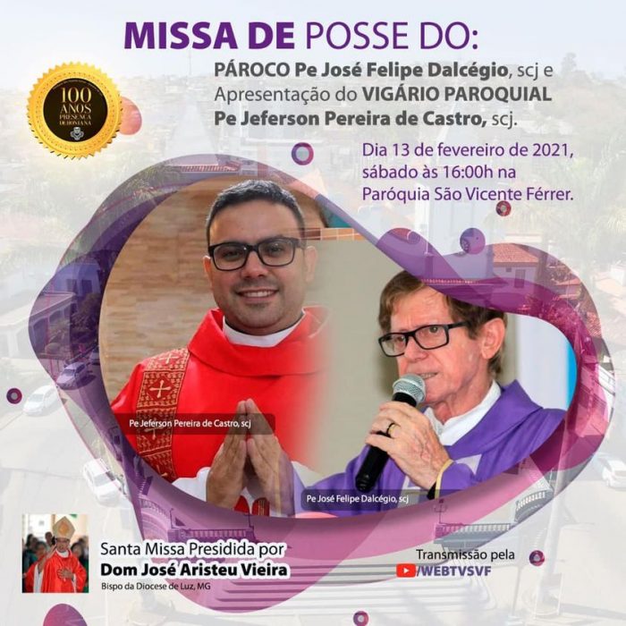 A Santa Missa de apresentação e posse canônica do pároco padre José Felipe Dalcégio, SCJ, e do vigário paroquial padre Jeferson Pereira de Castro, SCJ no dia 13 de fevereiro, sábado, às 16h00, na Matriz São Vicente Férrer, em Formiga.