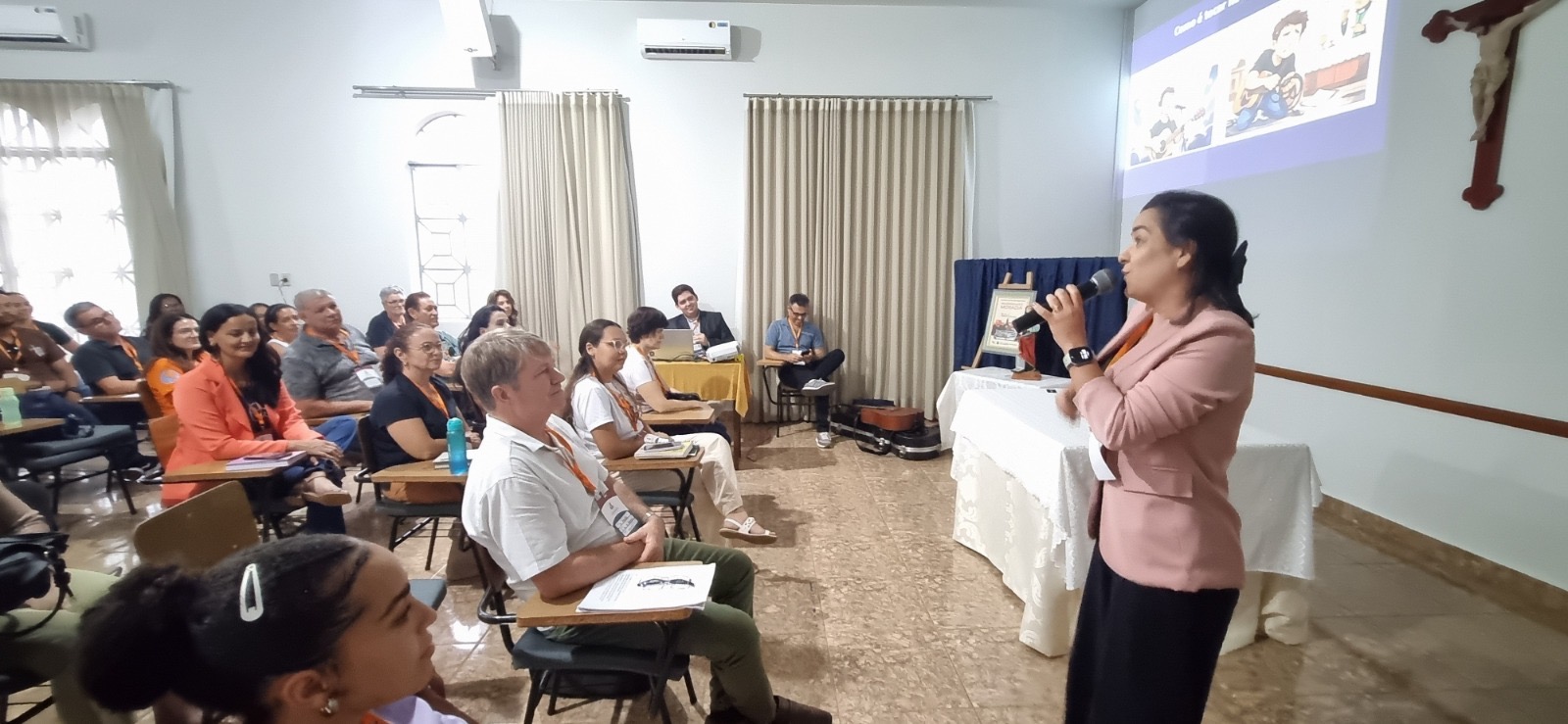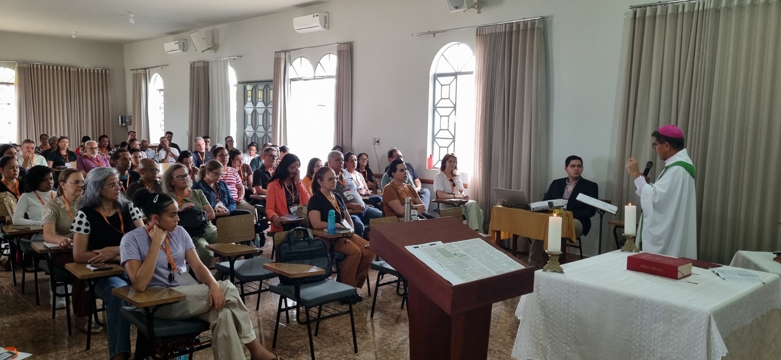A temática “Salmodiando na Missa” foi conduzida pelo padre Geraldo Agostinho, assessor da Pastoral do Canto, que se aprofundou no ministério do Salmista como aquele que canta a alegria do povo, apresentando o sentido dos salmos na história do povo de Israel e da comunidade de hoje.