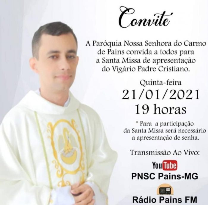Nesta quinta-feira, 21 de janeiro, será a Missa de apresentação e posse canônica do vigário padre Cristiano Caetano Leal na Paróquia Nossa Senhora do Carmo, em Pains.