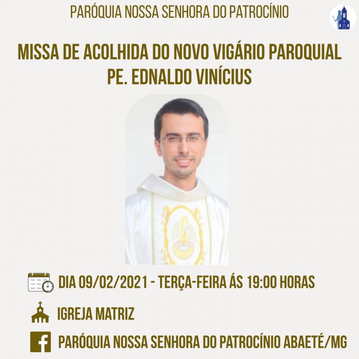 Na terça-feira, 09 de fevereiro, às 19h00, será a Missa de Apresentação e posse canônica do vigário da Paróquia Nossa Senhora do Patrocínio, em Abaeté: padre Ednaldo Vinícius Correia.