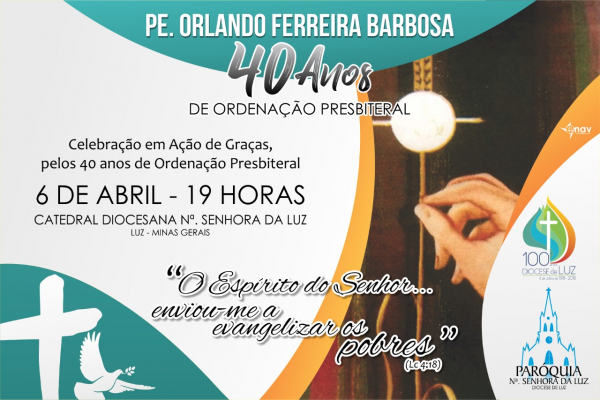 O pároco da Paróquia Nossa Senhora da Luz, em Luz, padre Orlando Ferreira Barbosa, comemorará 40 anos de ordenação sacerdotal.