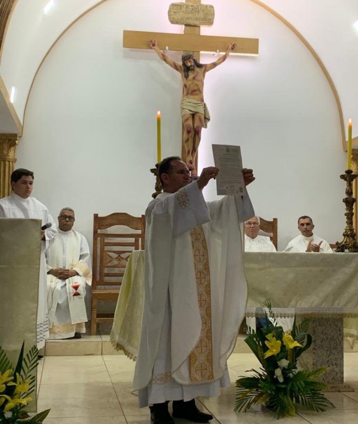 A celebração de acolhida e apresentação do novo pároco foi presidida pelo bispo diocesano, Dom José Aristeu, com a presença do vigário geral, padre Antônio Campos e de diversos padres da Forania de Abaeté.