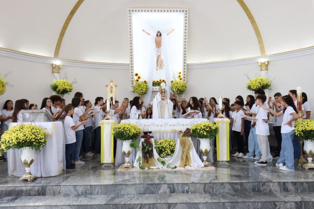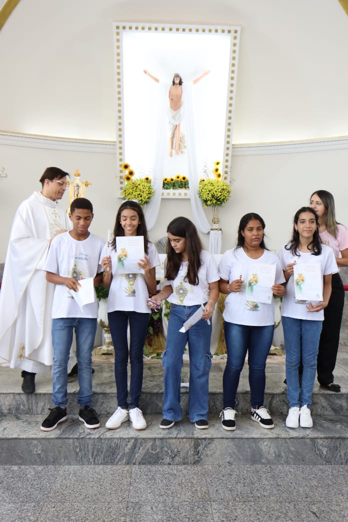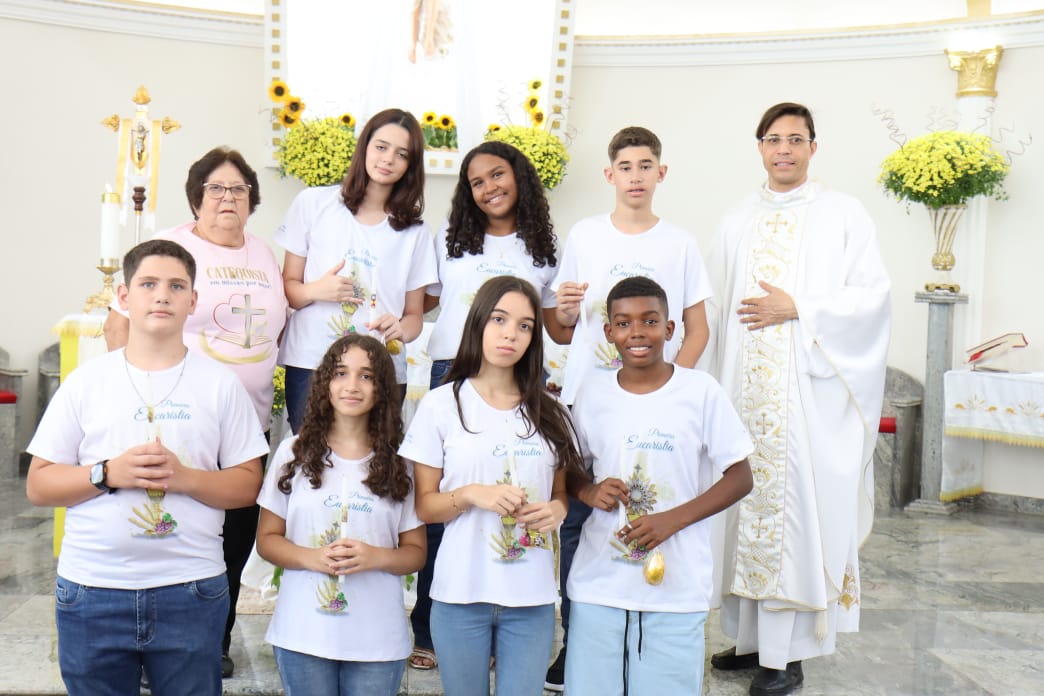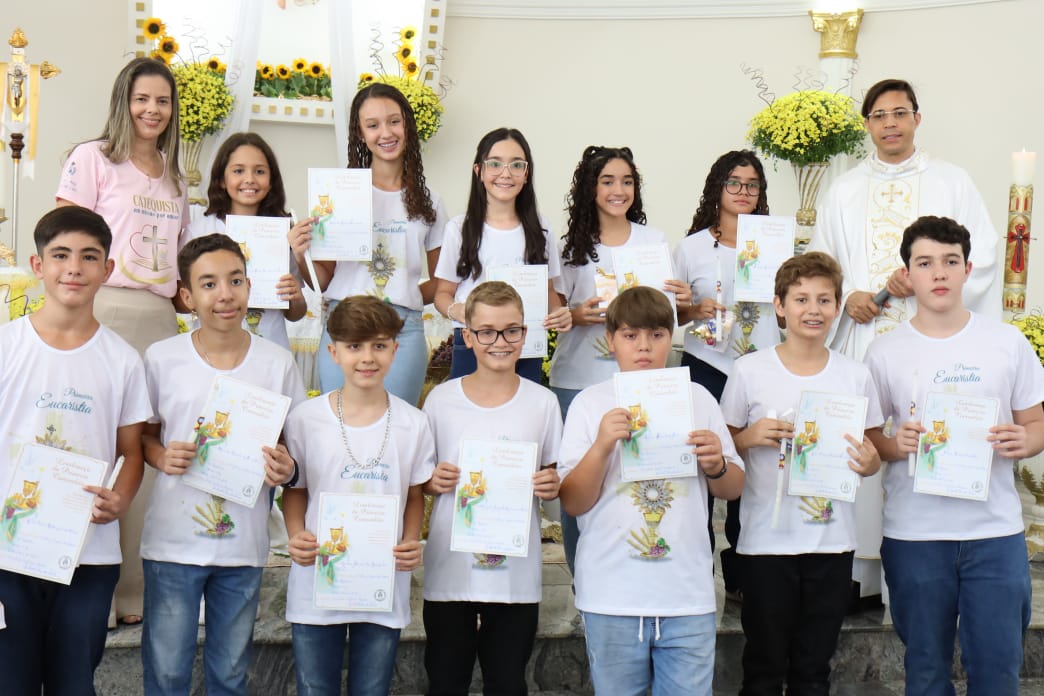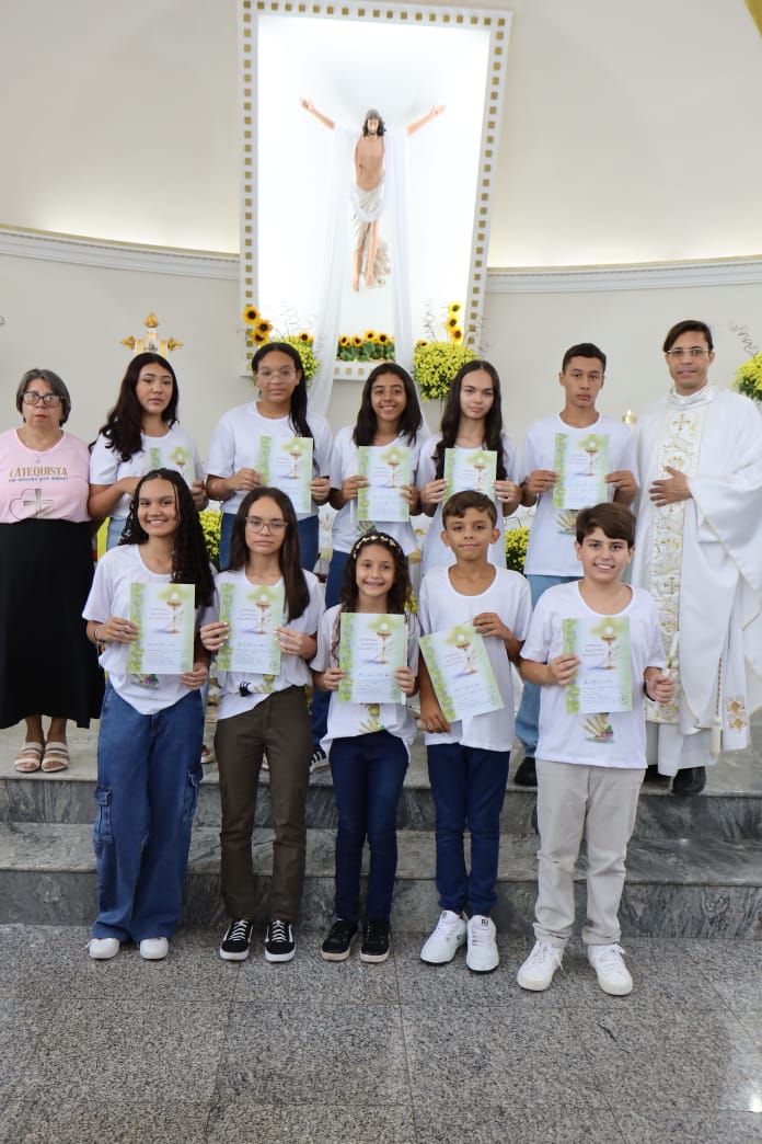 Na celebração presidida pelo pároco, padre Keroll Reis de Paula, 59 crianças receberam pela primeira vez, o Corpo e Sangue de Cristo, após três anos de preparação na Catequese.