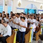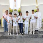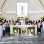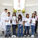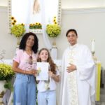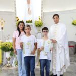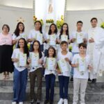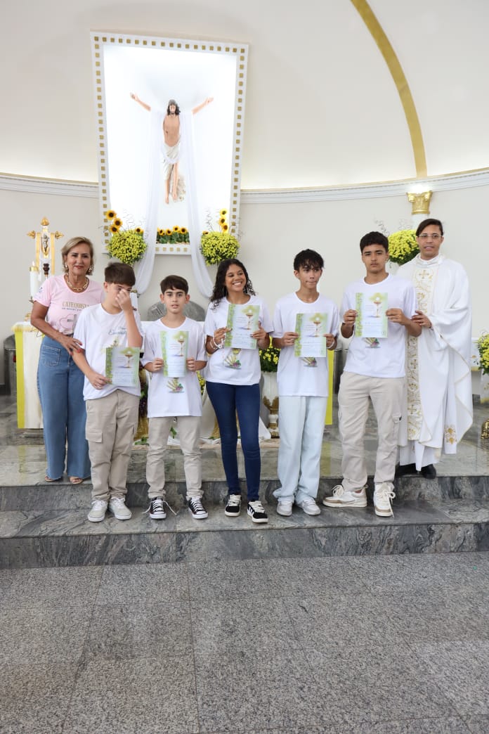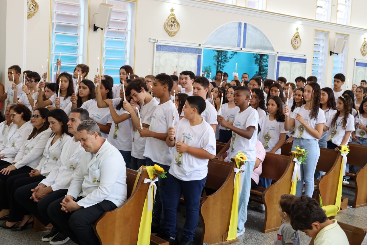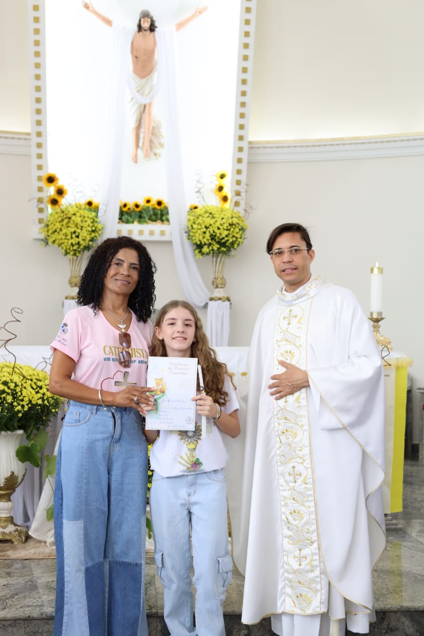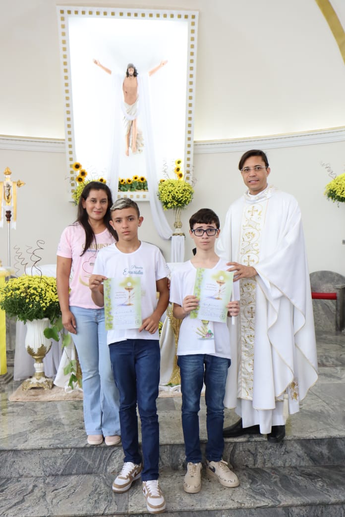 Na celebração presidida pelo pároco, padre Keroll Reis de Paula, 59 crianças receberam pela primeira vez, o Corpo e Sangue de Cristo, após três anos de preparação na Catequese.