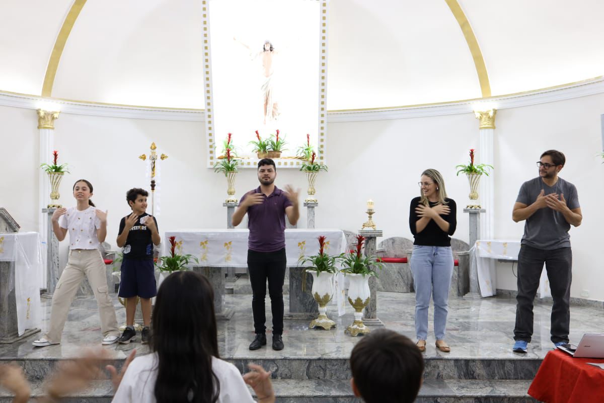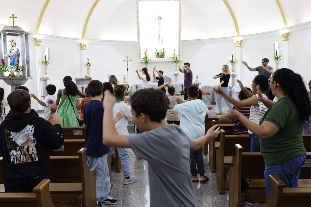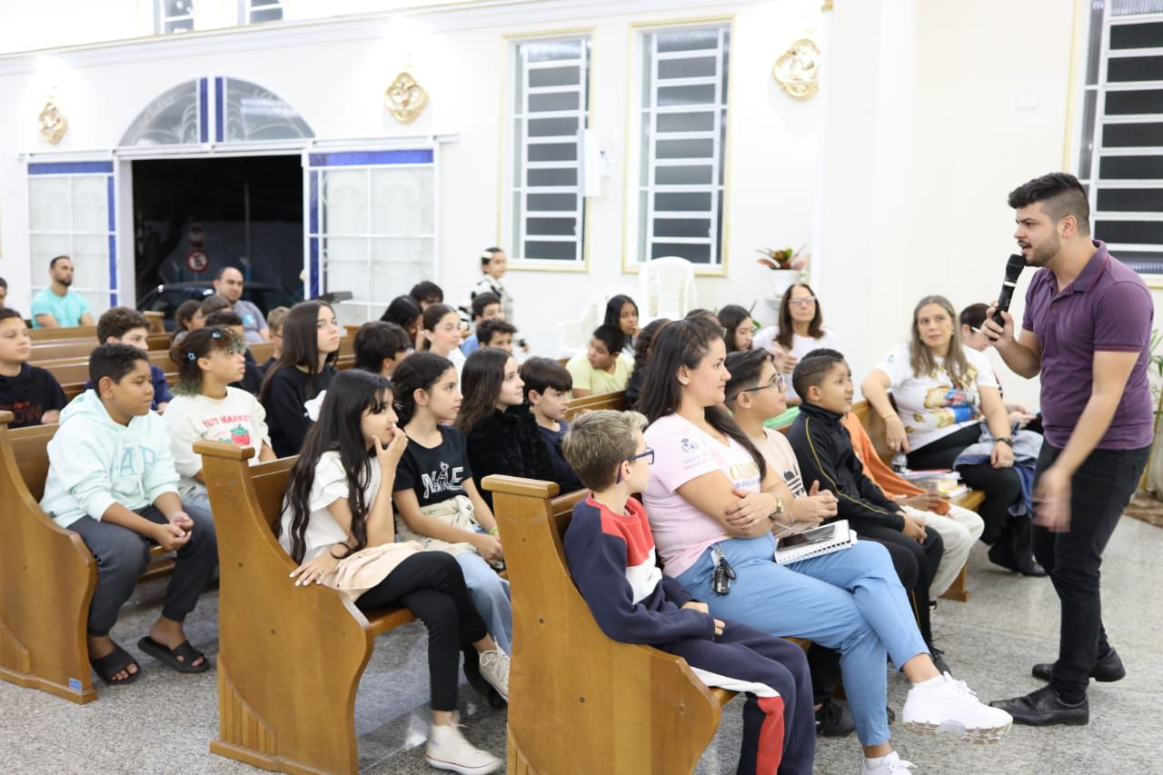 O seminárista Mateus abordou o tema de forma suave, com momentos de interação e descontração. Foram realizadas dinâmicas, envolvendo pais e catequizandos.