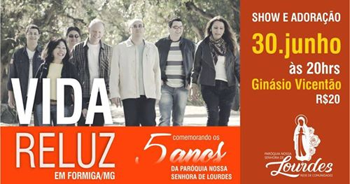 A Paróquia Nossa Senhora de Lourdes, em Formiga, celebrará, no dia 30 de junho, 5 anos de fundação. A data será comemorada com show da banda católica Vida Reluz. O evento ocorrerá no Ginásio Vicentão, às 20h. Os ingressos para o show estão sendo vendidos a R$20,00. Crianças até 10 anos terão entrada franca. O passaporte pode ser adquirido na própria paróquia, com os membros das células, nas livrarias: Livro Cor (Matriz São Vicente) e Adoração (Matriz Sagrado Coração de Jesus) e na loja Ana Luz, localizada no bairro Nossa Senhora de Lourdes. De acordo com o pároco da igreja, padre Fábio Lopes Vieira, toda a renda arrecadada com a venda dos ingressos será destinada para o término das obras da casa paroquial e do refeitório da igreja. “Iniciamos a obra há um ano e precisamos terminá-la o mais rápido possível, pois na paróquia não há local para acomodar os padres”, informou o religioso, que mora na casa paroquial da igreja Matriz São Vicente Férrer.