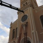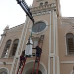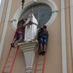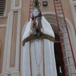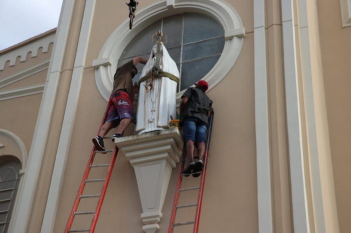 A imagem feita colocado por um guincho e profissionais. Ela é de cimento, mede cerca de 2,20m, pesa em torno de 150kg e foi construída pelo artesão Wellington Melo.