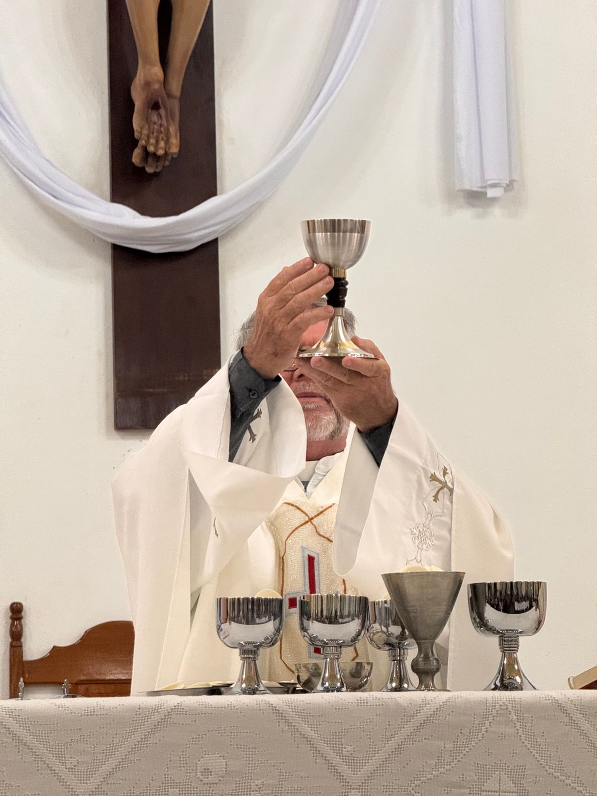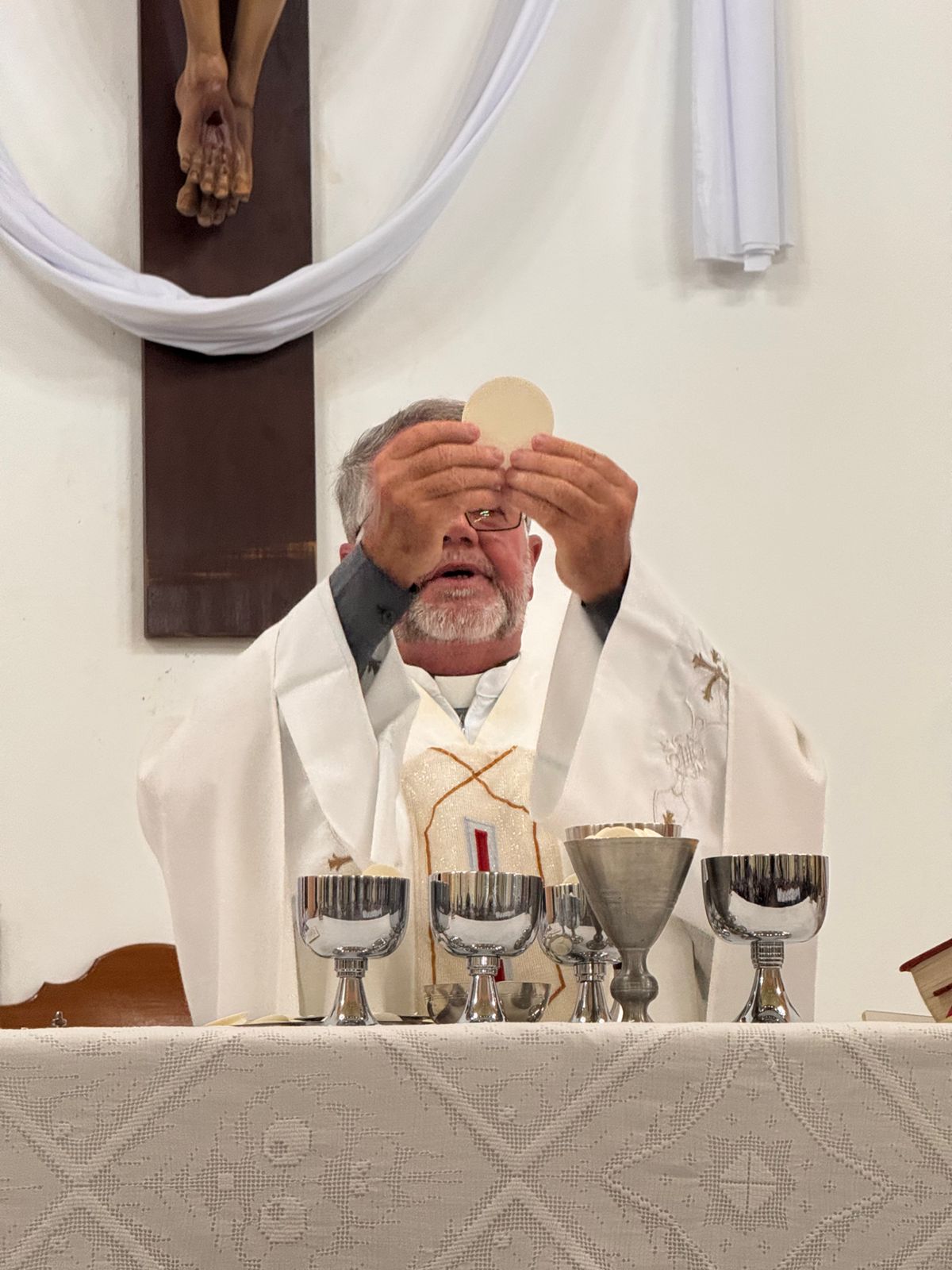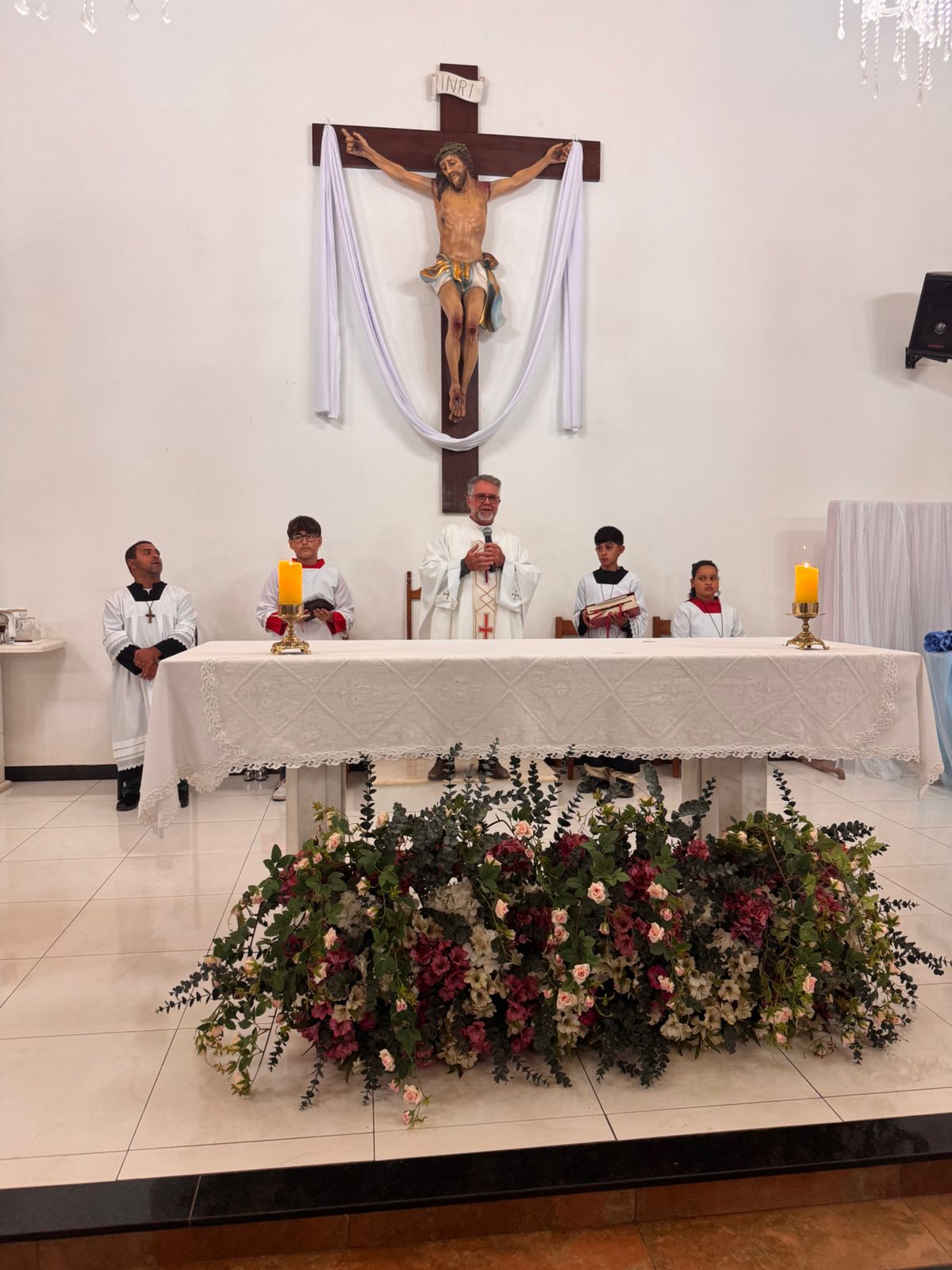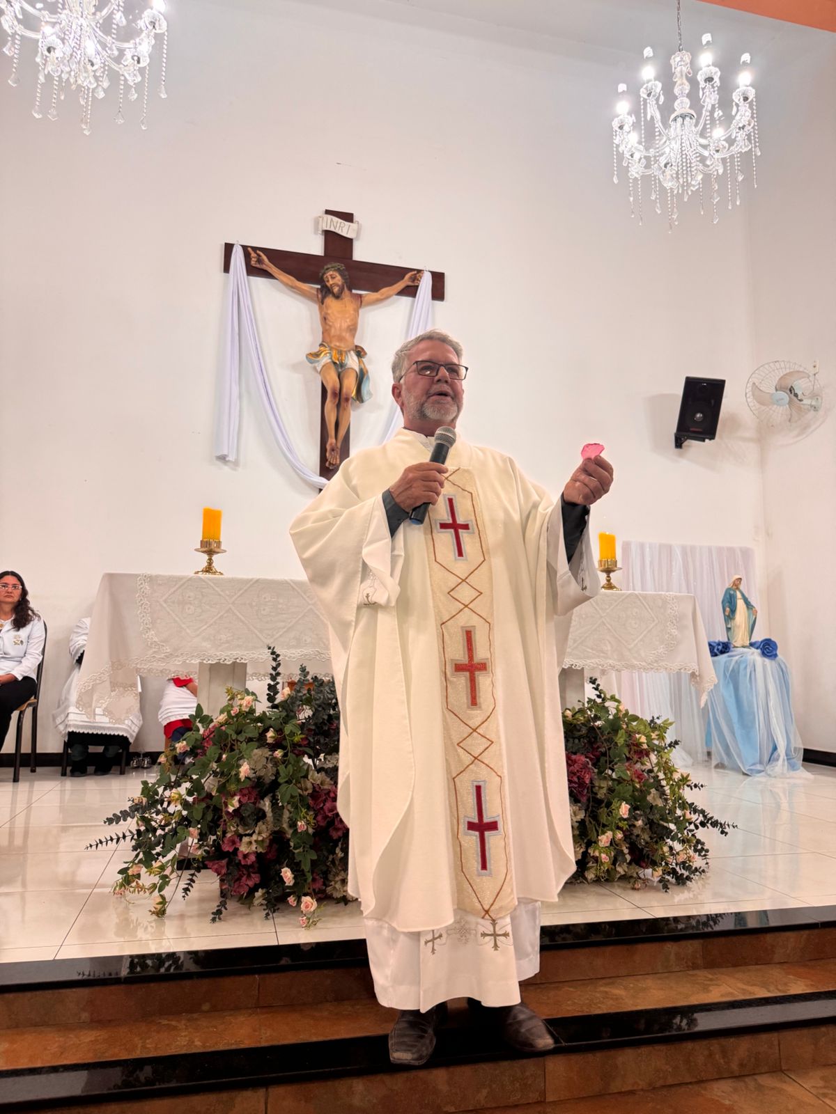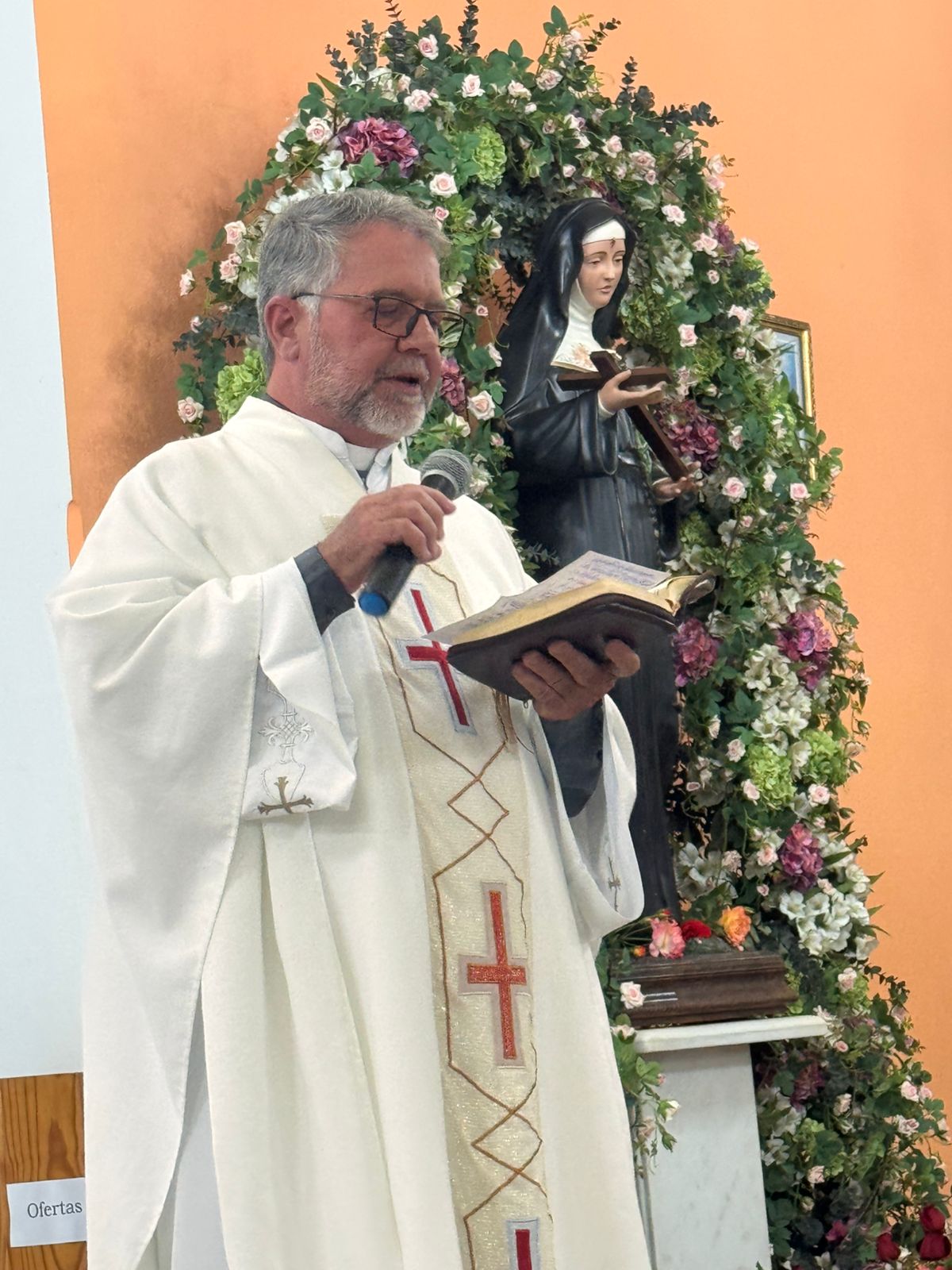 A celebração foi presidida pelo pároco, padre Ivanildo Miranda, que em sua homilia refletiu sobre o significado da rosa na vida de Santa Rita. Recordou o famoso episódio de sua vida, quando, em seus últimos dias no convento e já muito debilitada, Santa Rita pediu uma rosa do jardim de sua antiga casa. Era inverno, mas mesmo assim, por milagre, encontraram uma única rosa florida — sinal de que Deus escuta até os menores desejos de um coração fiel e entregue.