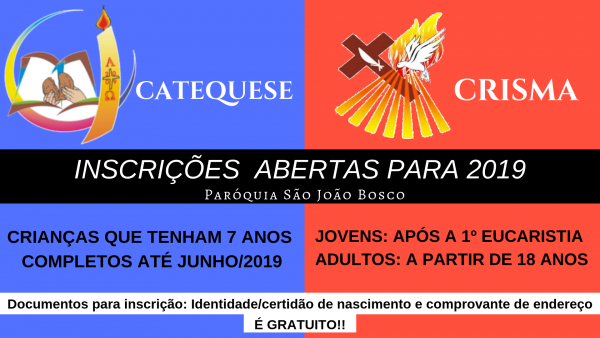 A Catequese são para crianças a partir de 07 anos completos até junho de 2019, e para a Crisma são para jovens a partir da Primeira Eucaristia e ou adultos a partir de 18 anos.