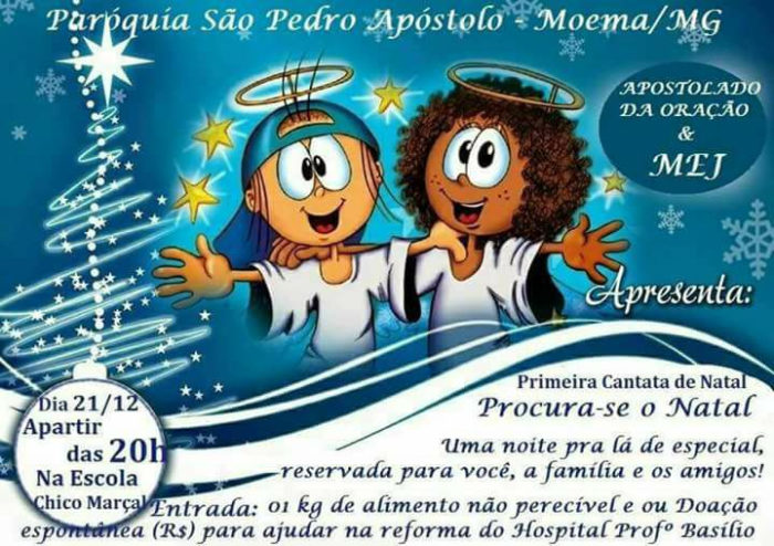 A Paróquia São Pedro, em Moema, juntamente com o Apostolado da Oração e o MEJ (Movimento Eucarístico Jovem) convidam a todos para a primeira Cantata de Natal – “Procura-se o Natal”, que será realizada no dia 21 de dezembro, quinta-feira, às 20h00, na Escola Chico Marçal.