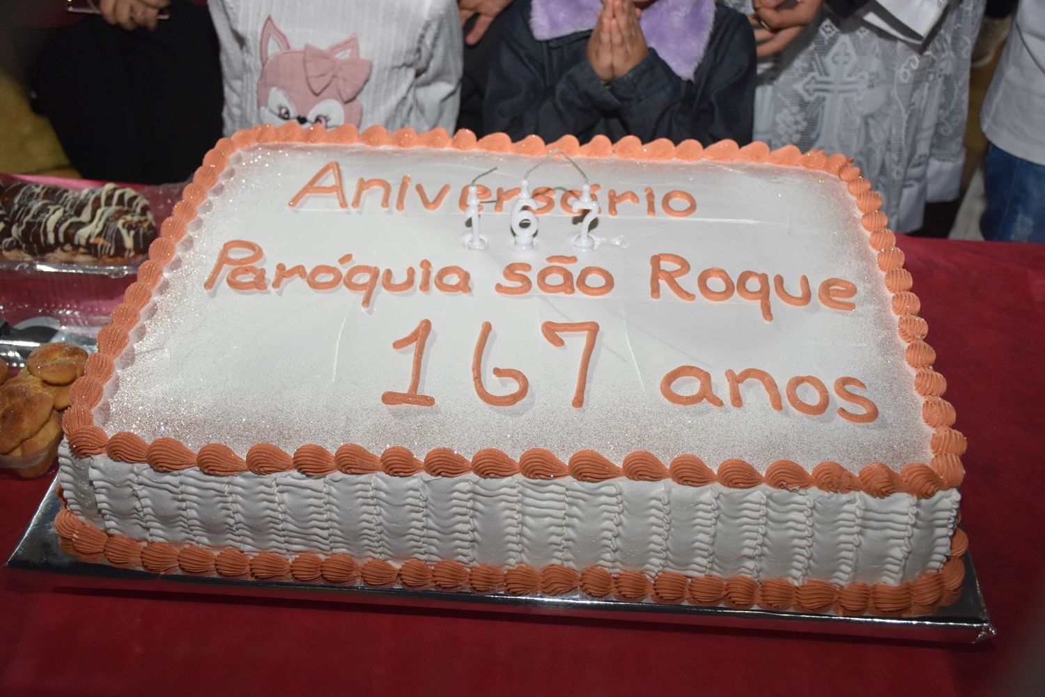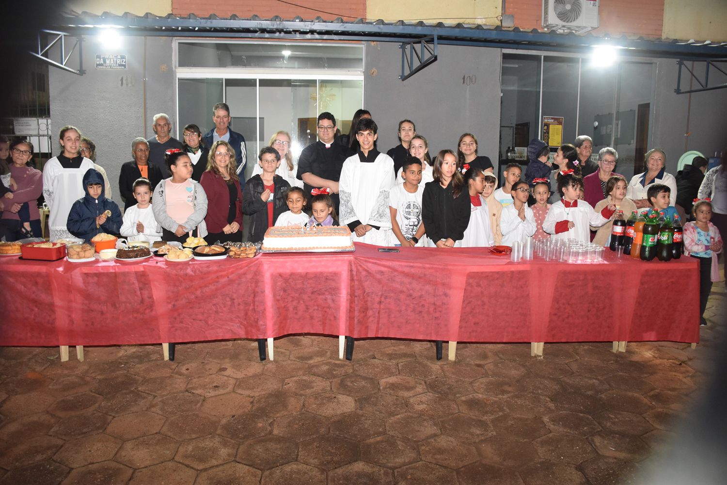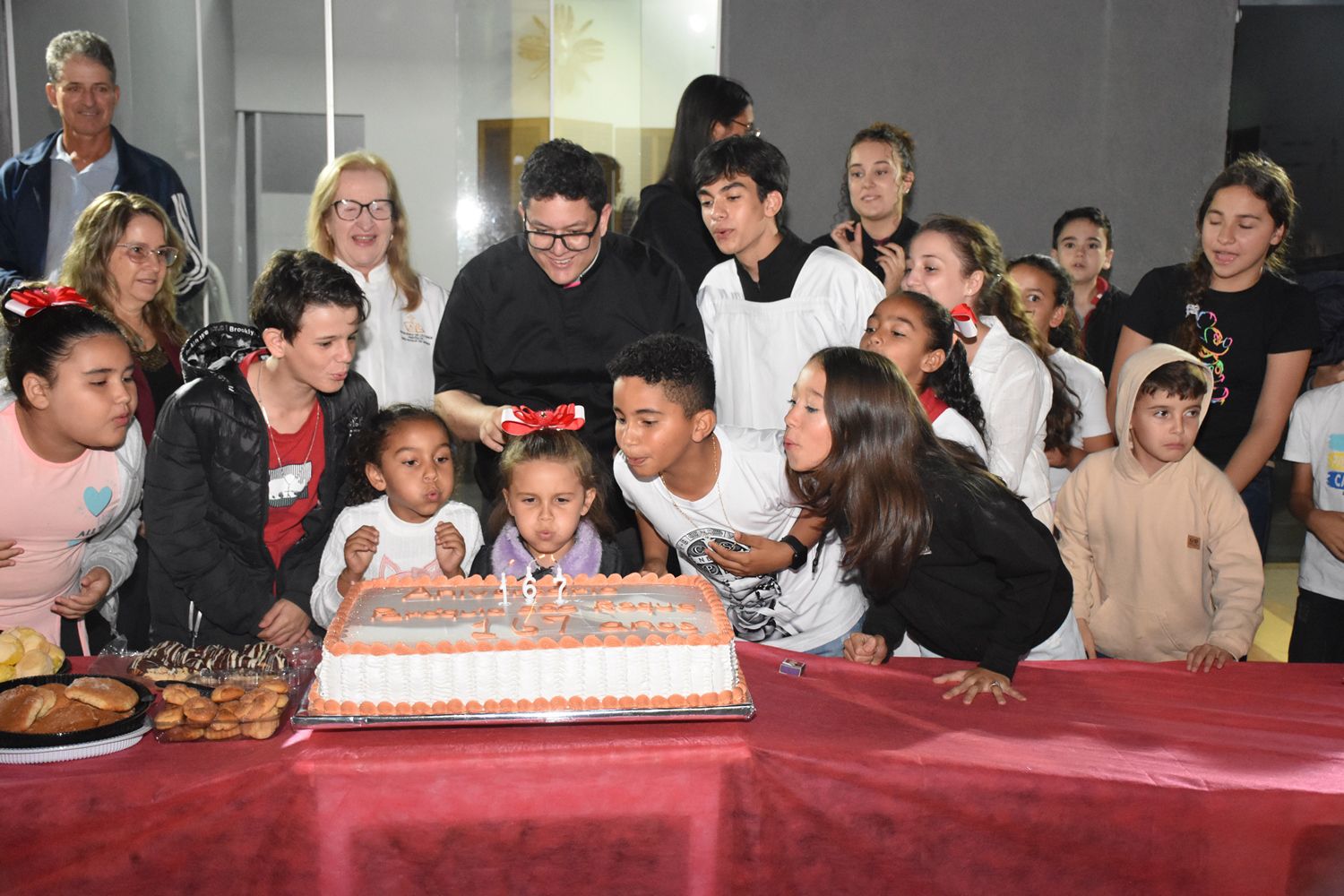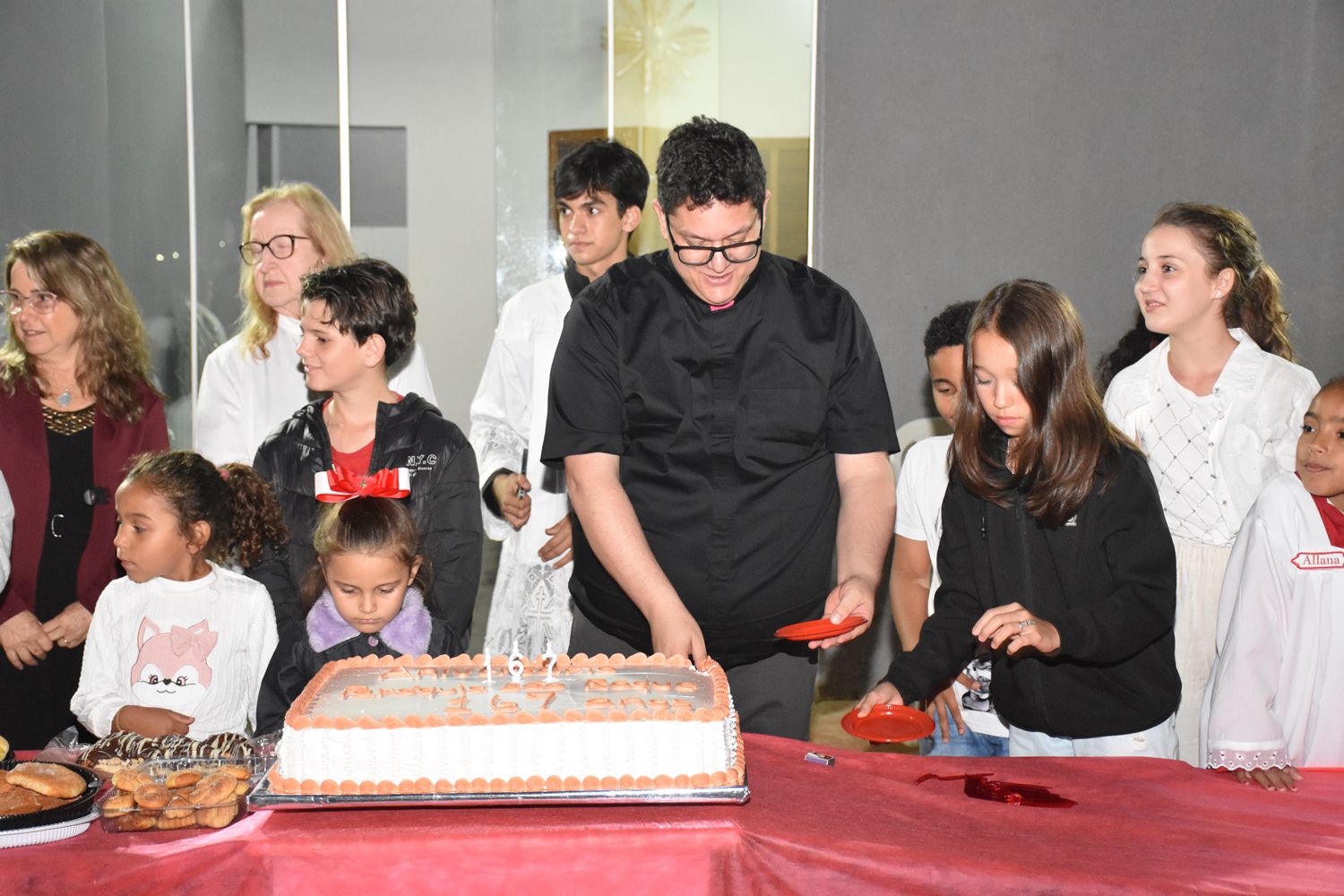 Após a celebração, as comemorações continuaram, com um momento de confraternização, cantando parabéns e partilhando o bolo de aniversário com os presentes.