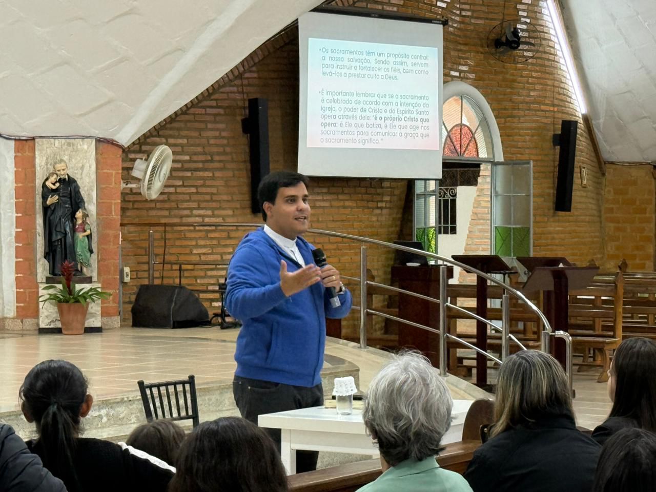 Padre Marco Túlio Gomes, pároco local e assessor do encontro formativo, ensinou que a palavra “Eucaristia” vem do grego eucharistia, que significa ação de graças. Desde os primeiros séculos, a Igreja reconhece a Eucaristia como memorial da paixão, morte e ressurreição de Jesus Cristo. Ela não é apenas um símbolo, mas o verdadeiro Corpo e Sangue de Nosso Senhor, presente sob as espécies do pão e do vinho.