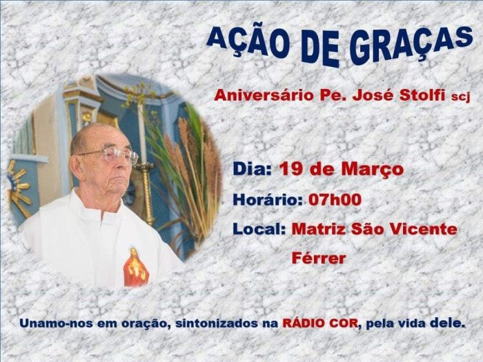 Na sexta-feira, 19 de março, às 07h00, na Igreja Matriz São Vicente Férrer, a paróquia homenageará o vigário padre José Stolfi, pelos seus 89 anos de vida.