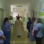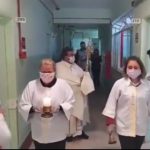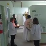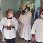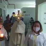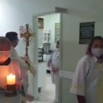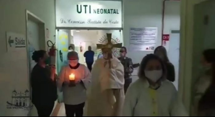 O sacerdote percorreu com o Santíssimo pela Maternidade, UTI Neonatal, Enfermarias, UTI Adulto, Bloco Cirúrgico, refeitório e setores administrativos da entidade.