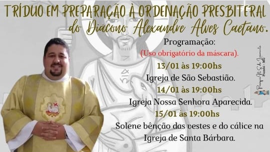 O diácono Alexandre Alves Caetano será ordenado presbítero no sábado, 16 de janeiro, às 09h30, na Igreja Matriz da Paróquia Nossa Senhora do Livramento, na cidade de Piumhi.