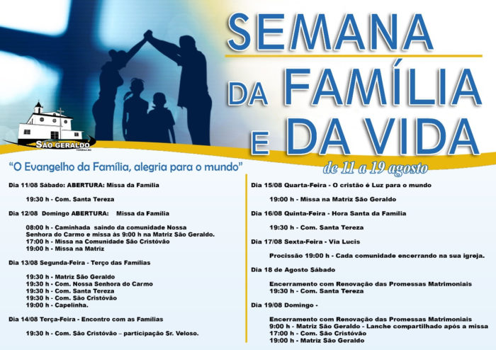 2ª feira (13/08) – 19h00 – Celebração da Palavra, em seguida o terço da família na matriz.