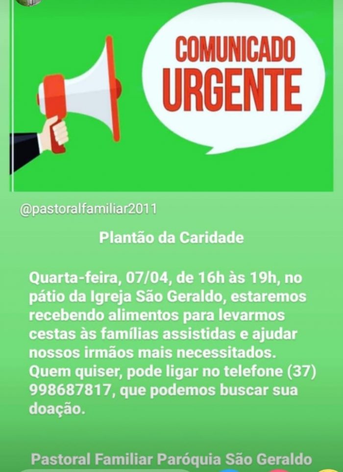 A Paróquia São Sebastião, de Formiga, juntamente com a Pastoral Familiar promoverão na quarta-feira, 07 de abril, o Plantão da Caridade. Neste dia, no período das 16h às 19h00, estarão recebendo no pátio da Igreja Matriz alimentos que serão doados à famílias carentes.