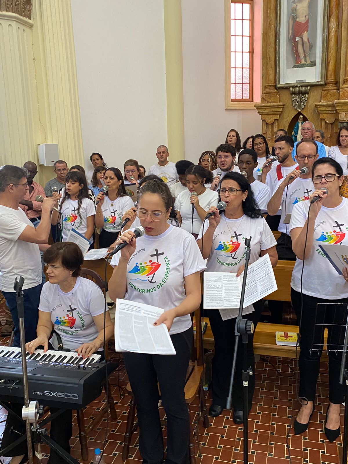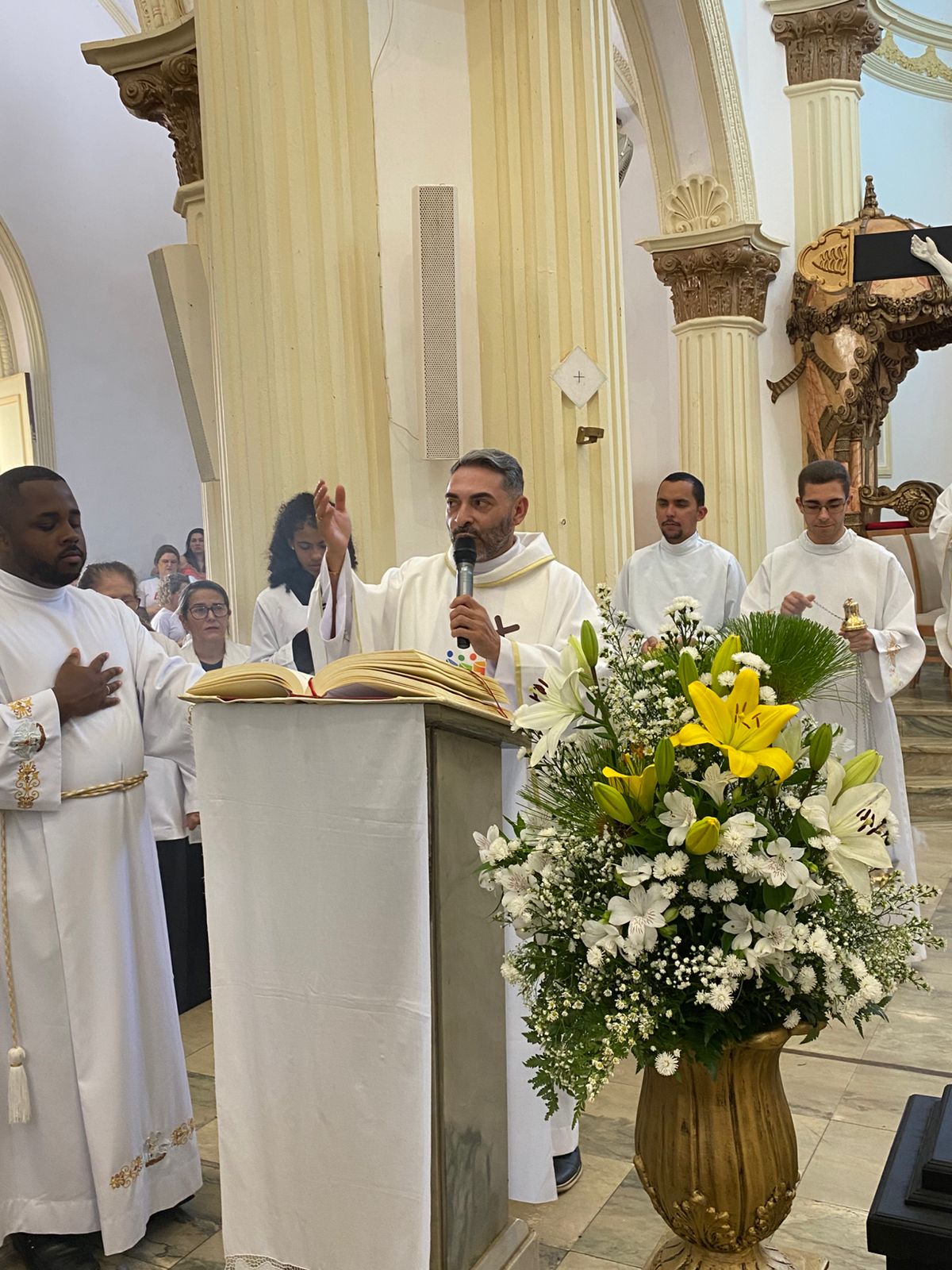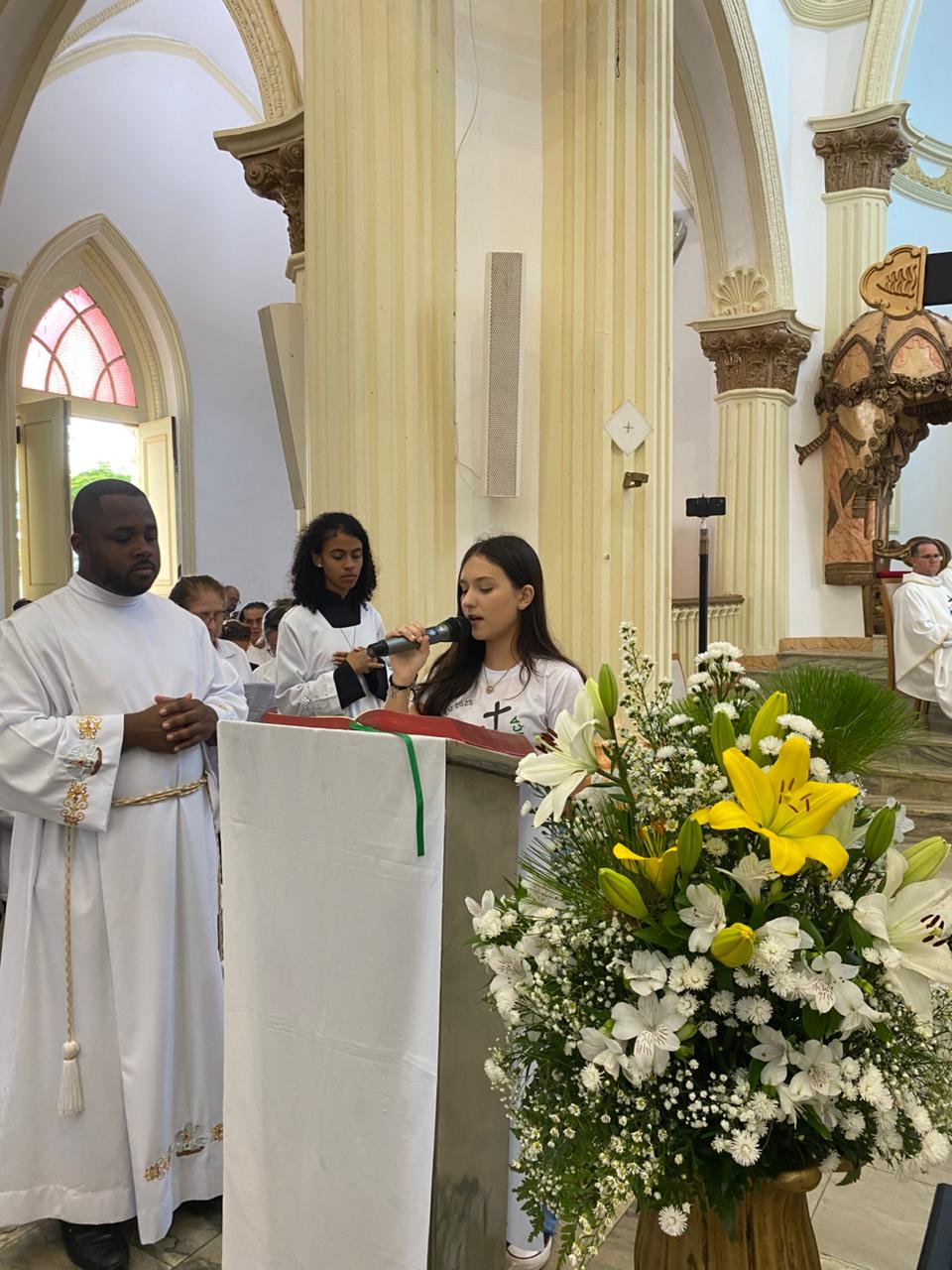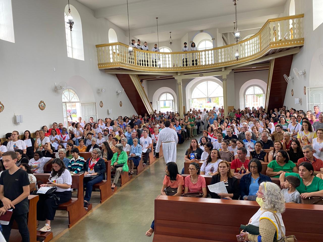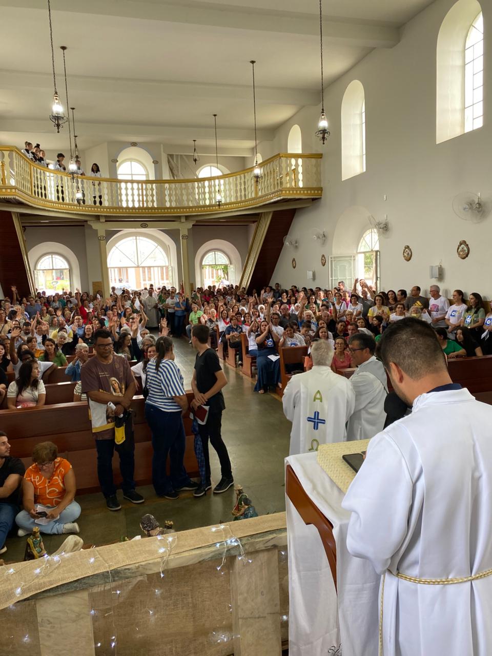 Com a entrada dos fiéis na Catedral Diocesana, os ministros ordenados aspergiram todos com a água batismal, recordando a filiação divina e o compromisso missionário de cada peregrino. Em seguida, seguiu-se a Santa Missa com a Liturgia da Palavra e a Liturgia Eucarística.