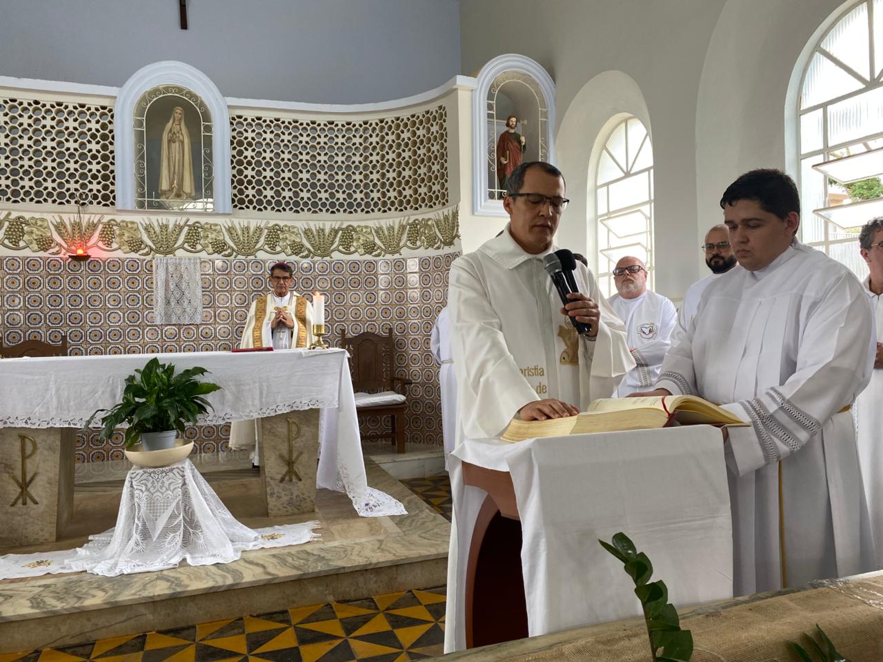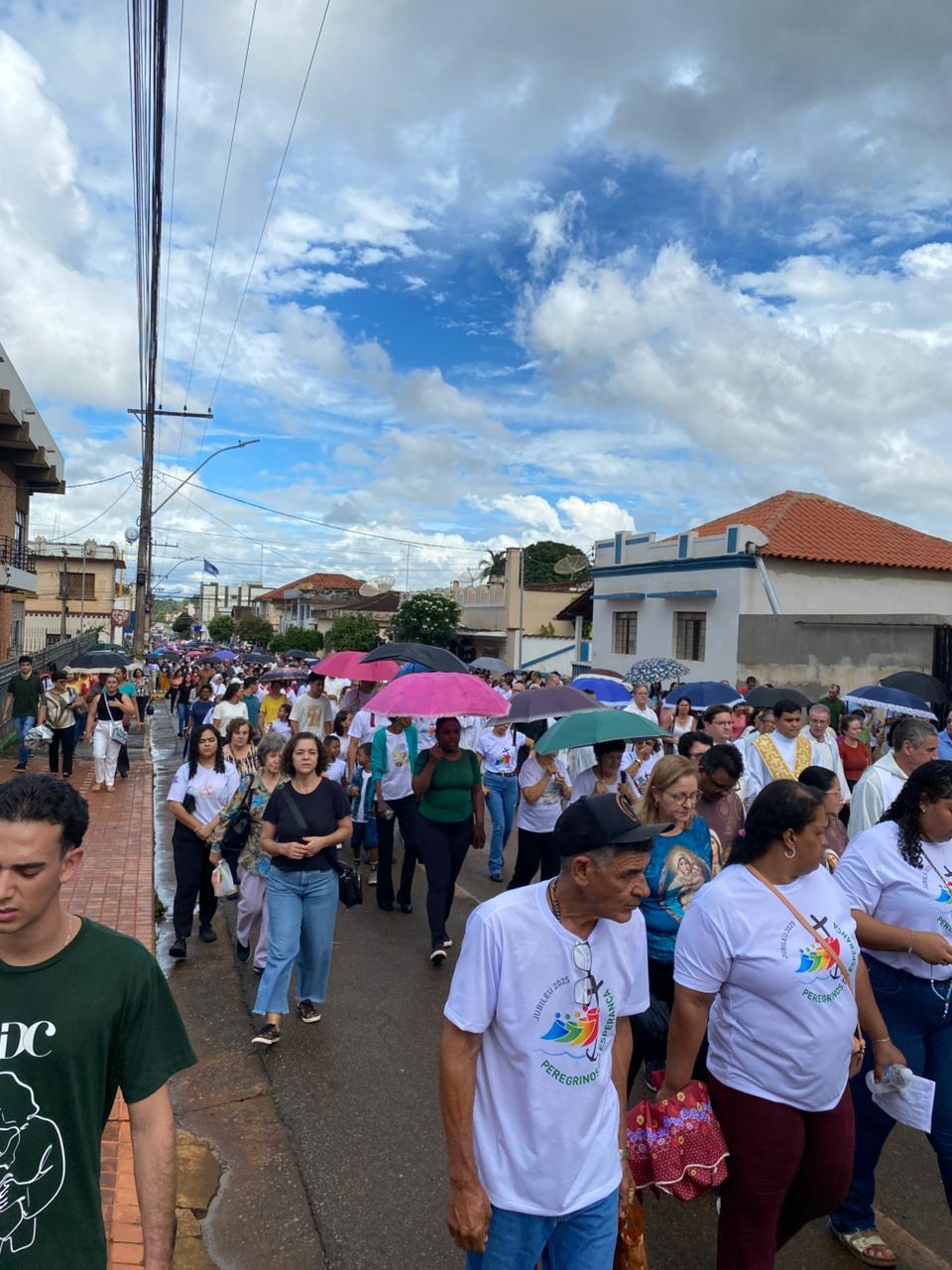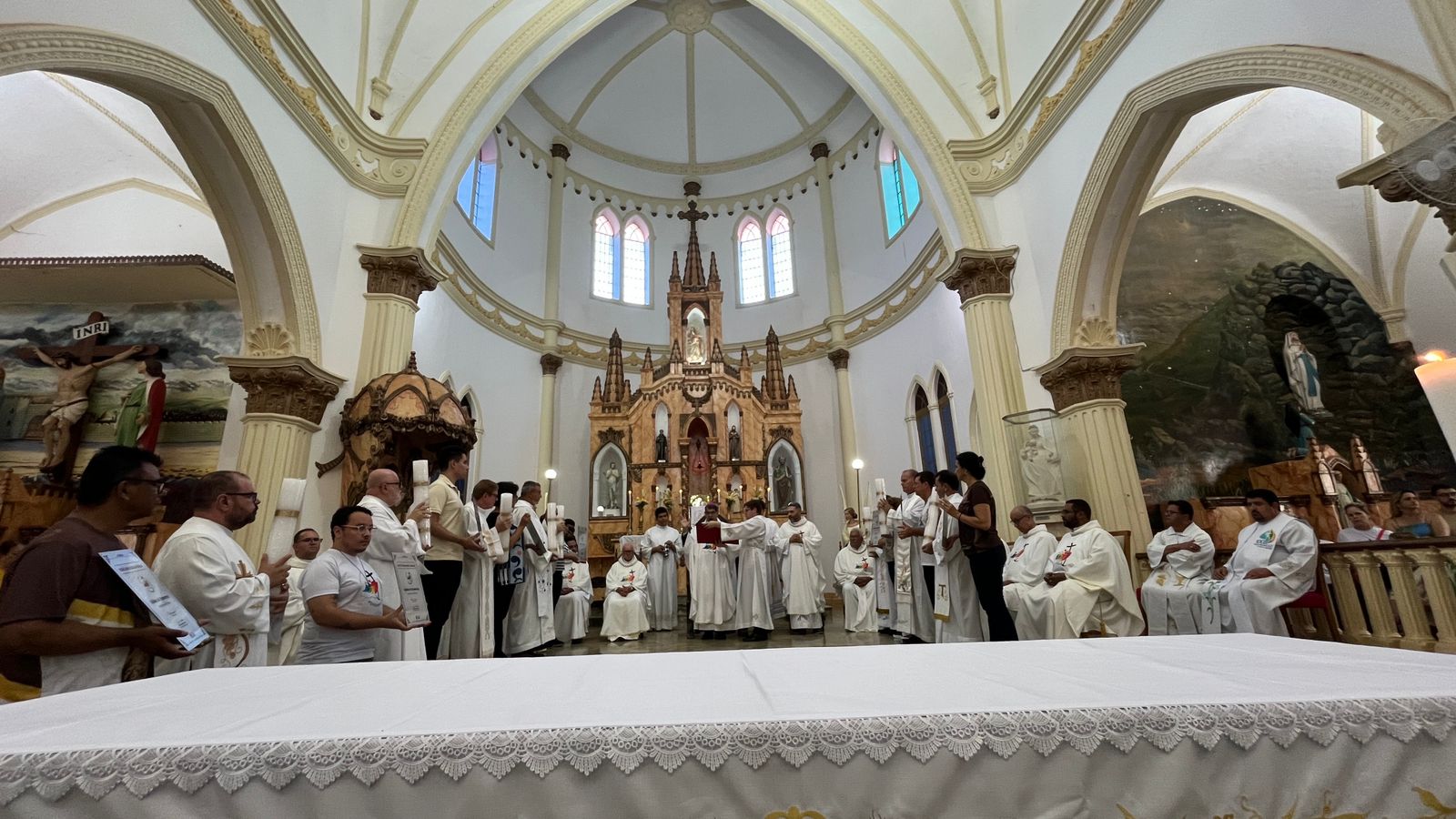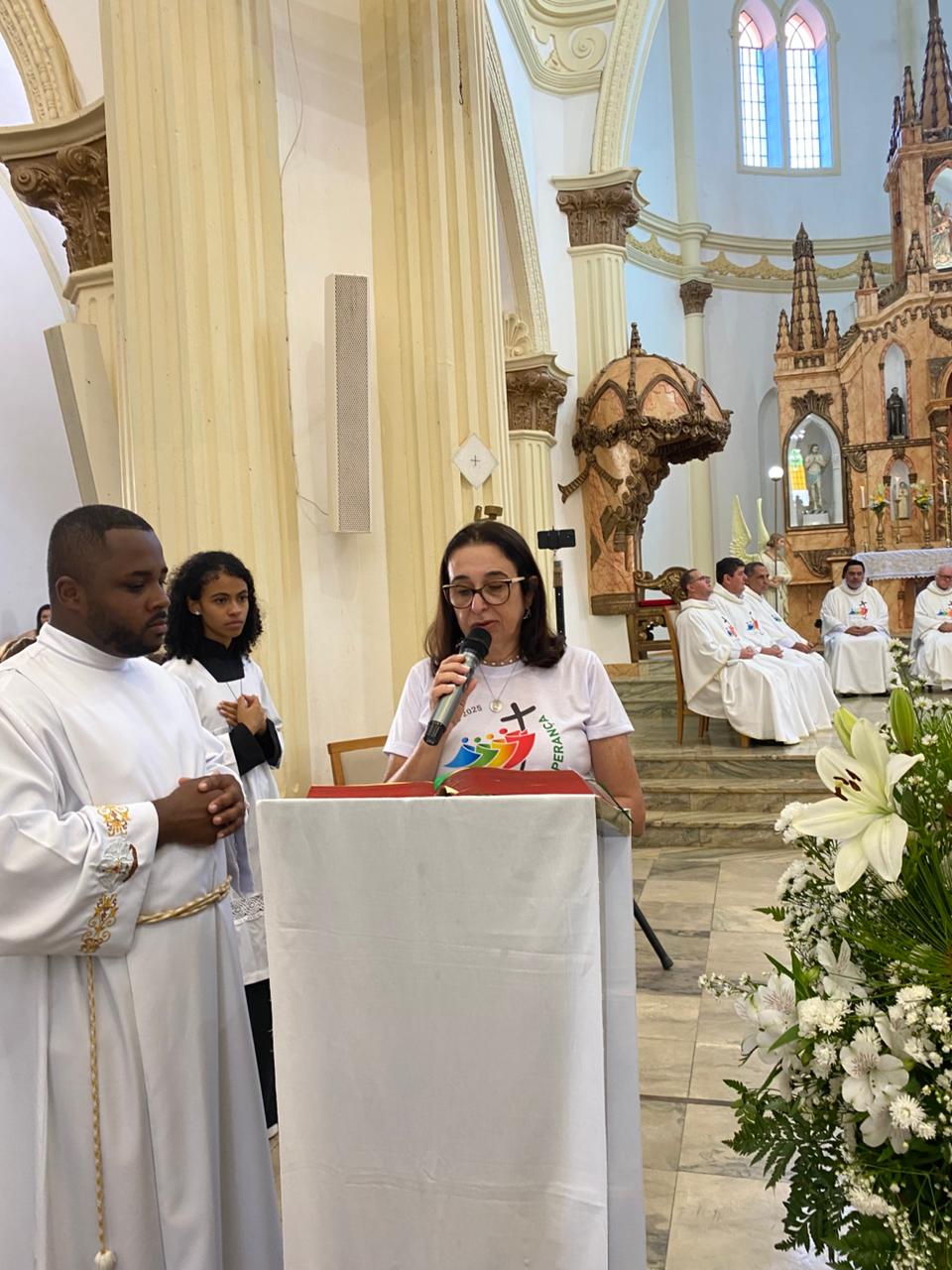 Com a entrada dos fiéis na Catedral Diocesana, os ministros ordenados aspergiram todos com a água batismal, recordando a filiação divina e o compromisso missionário de cada peregrino. Em seguida, seguiu-se a Santa Missa com a Liturgia da Palavra e a Liturgia Eucarística.