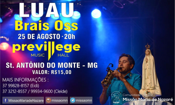 A Missão Maria de Nazaré, da Diocese de Divinópolis, promoverá no mês de agosto, nas cidades de Divinópolis e Santo Antônio do Monte, o Luau do Brais Oss, da Comunidade Canção Nova/SP. Considerado o maior luau católico do mundo, ele é uma das atrações principais nos acampamentos PHN, Hosana Brasil e no Carnaval, na Canção Nova.