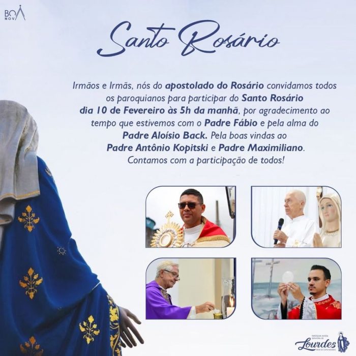 O Rosário será na intenção de agradecimento do tempo de caminhada e missão do pároco padre Fábio Lopes Vieira, SCJ, que será transferido para a cidade de Barretos/SP; pela alma do ex-vigário padre Aloísio Back, que faleceu no dia 07 de janeiro deste ano, por complicações da Covid-19 e também pelas boas-vindas aos novos padres: o pároco padre Antônio Kopitski, SCJ, e o vigário padre Maximiliano Delfino Cândido, SCJ.