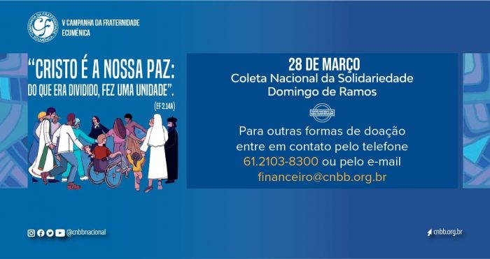 “A solidariedade cura as feridas, mata a fome e promove a dignidade humana. A solidariedade é uma marca da autenticidade cristã. No próximo dia 28 de março, Domingo de Ramos, observando as medidas sanitárias e de distanciamento social, não deixe de expressar a sua caridade contribuindo, com qualquer valor, em sua comunidade e paróquia para a Coleta Nacional da Solidariedade”, disse.